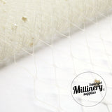 1m (1.09 yards) of lovely 12 inch (30.4cm) wide English merry widow veiling has 5mm ivory half dome pearls adorning it. Width of veiling diamonds are 1.9cm (3/4 inch), much larger than standard veiling and perfect for adding a hint of sparkling vintage style to your millinery projects.