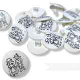 This pack of 10 vintage buttons remind us of our childhood! Totally new unused stock from the 1980's, these plastic buttons are off-white in colour and feature a Dutch couple printed onto the buttons face.