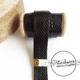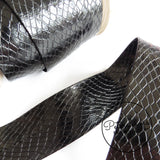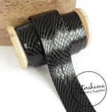 This high quality black imitation snakeskin trim is made from shiny PVC and would look fabulous wrapped around the crown of a hat. Can also be easily folded in half to make a binding!