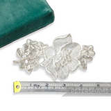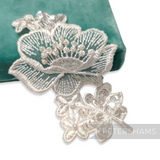 This motif is simply perfect for bridal work - ivory glossy threads embroidered into a rose shape outline this lace motif which is accentuated with faux ivory pearls, tube beads and translucent ivory sequins. It's a classy piece that would work so well across many styles.