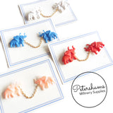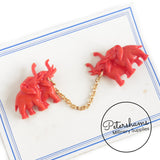 These adorable elephants date to the 1950s and are on their original card! Designed to pin to a collar or cardigan, they would also be super cute used as a brooch. Connected in the middle by a gold tone chain, they have a gold metal safety pin type closure at back.