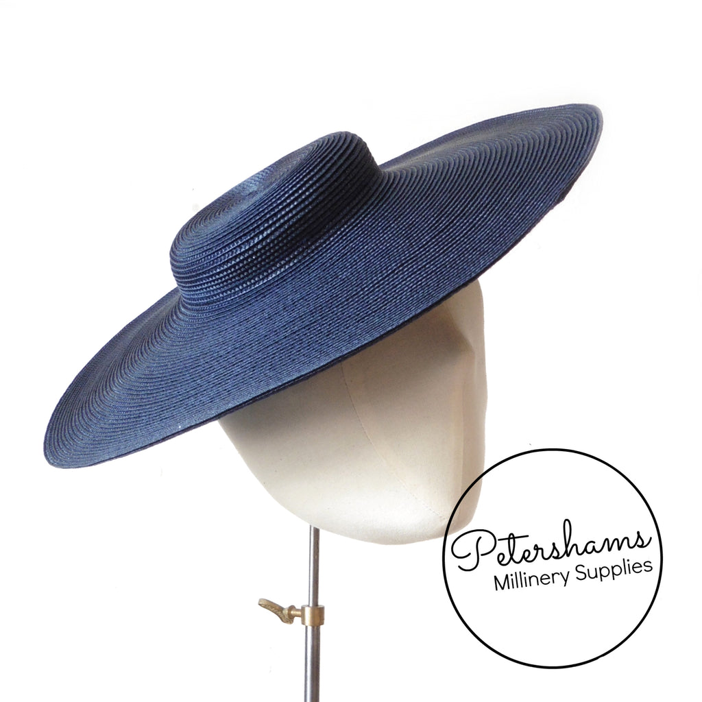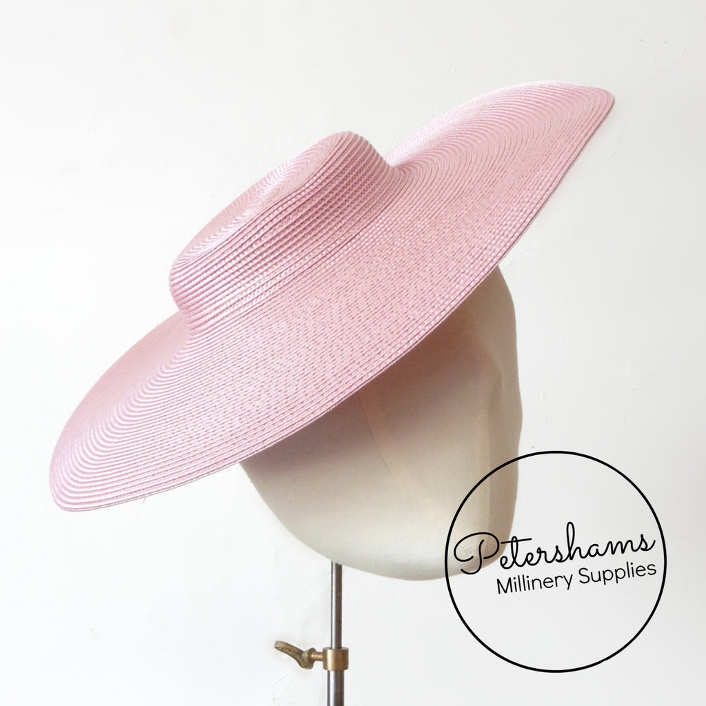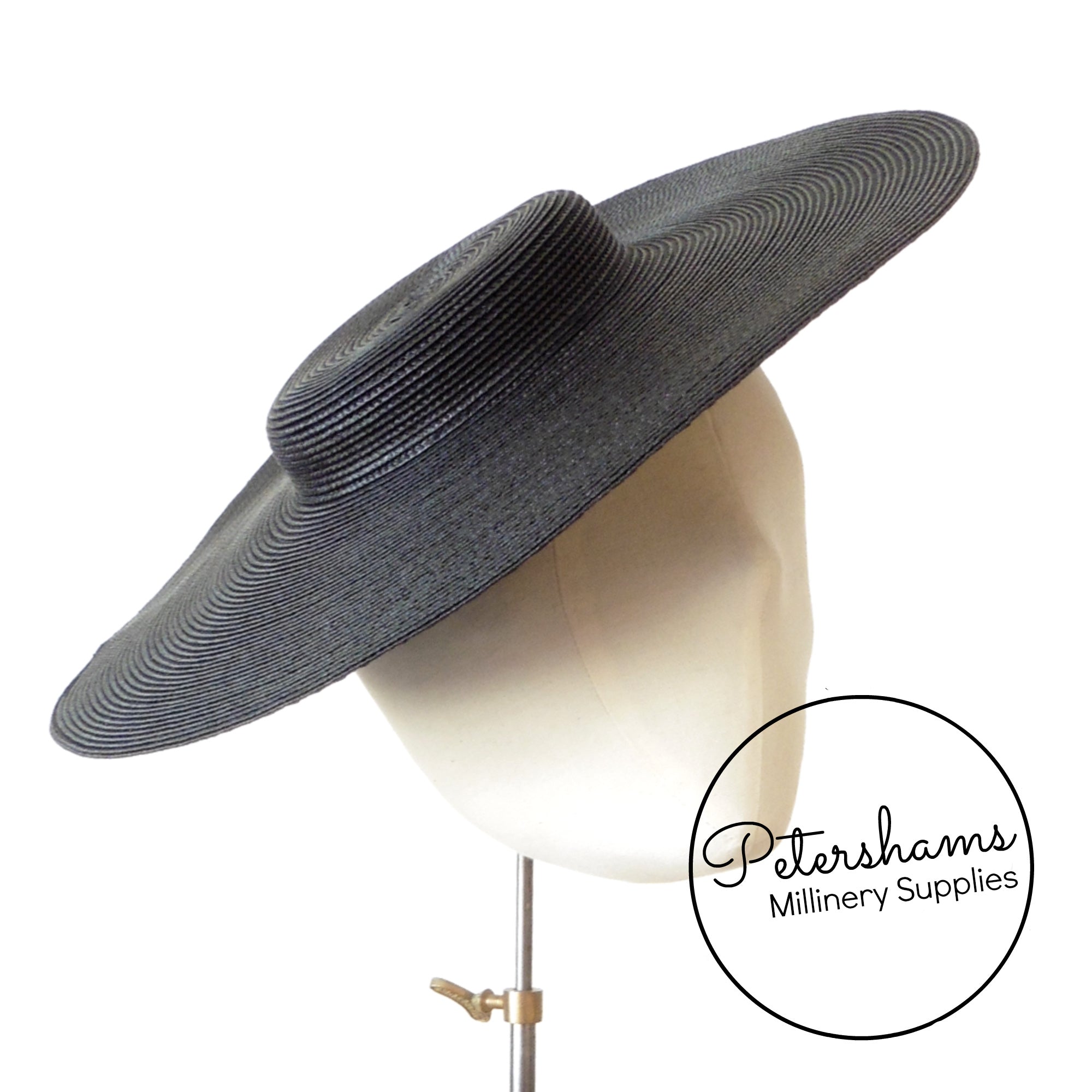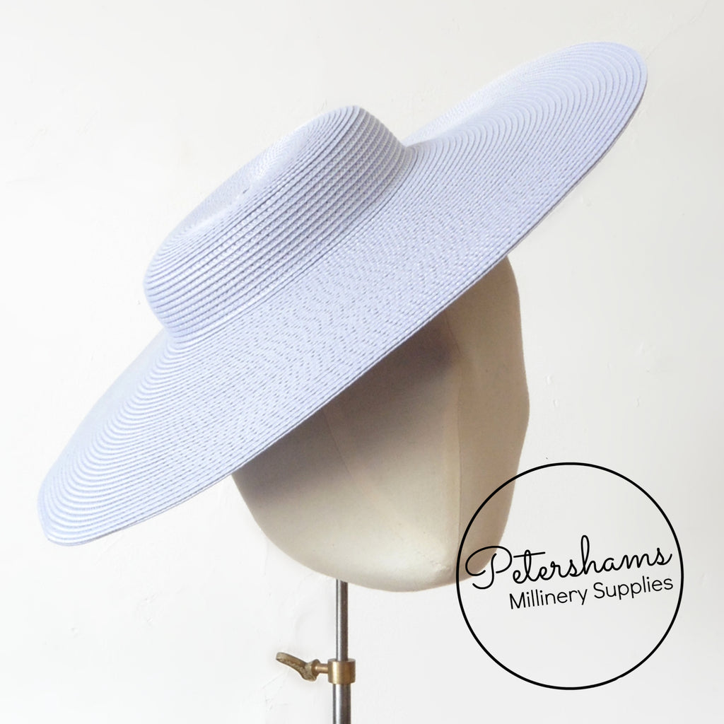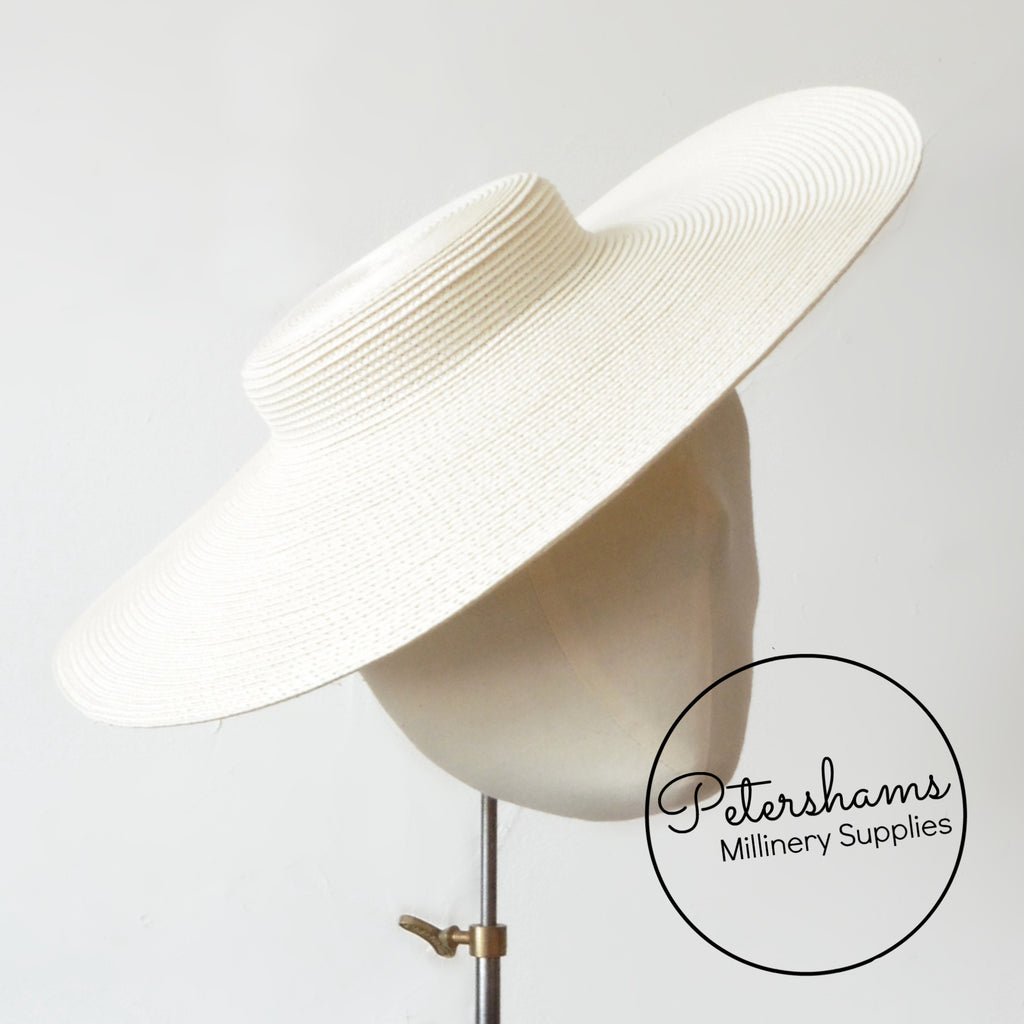 This cartwheel hat base is a classic shape that has sprung into popularity in the past year. Made from polybraid that has been spiraled and blocked, it has a petersham ribbon sewn into the inside crown for stability.