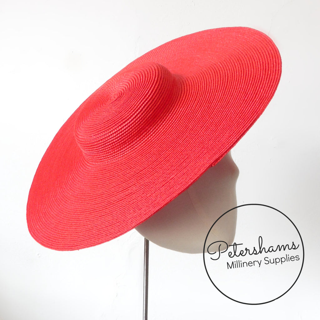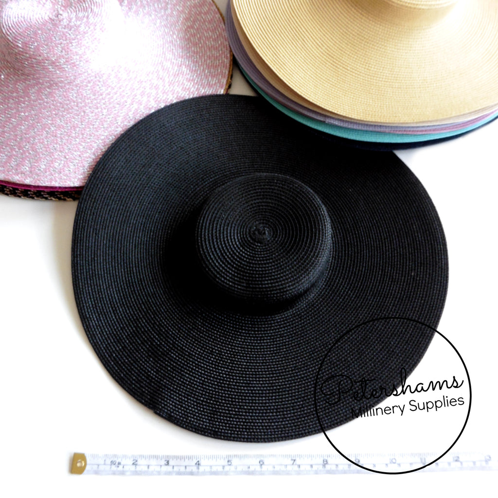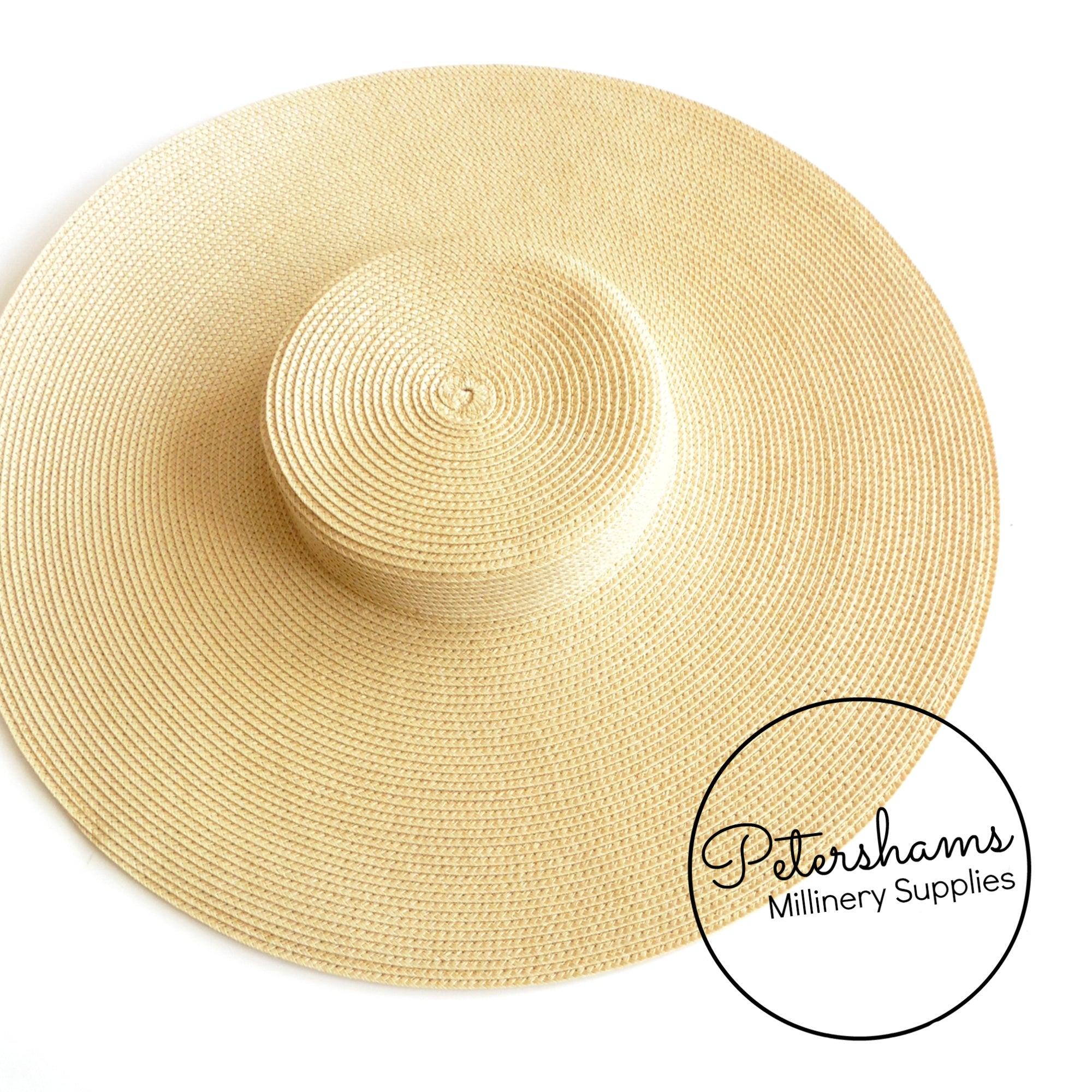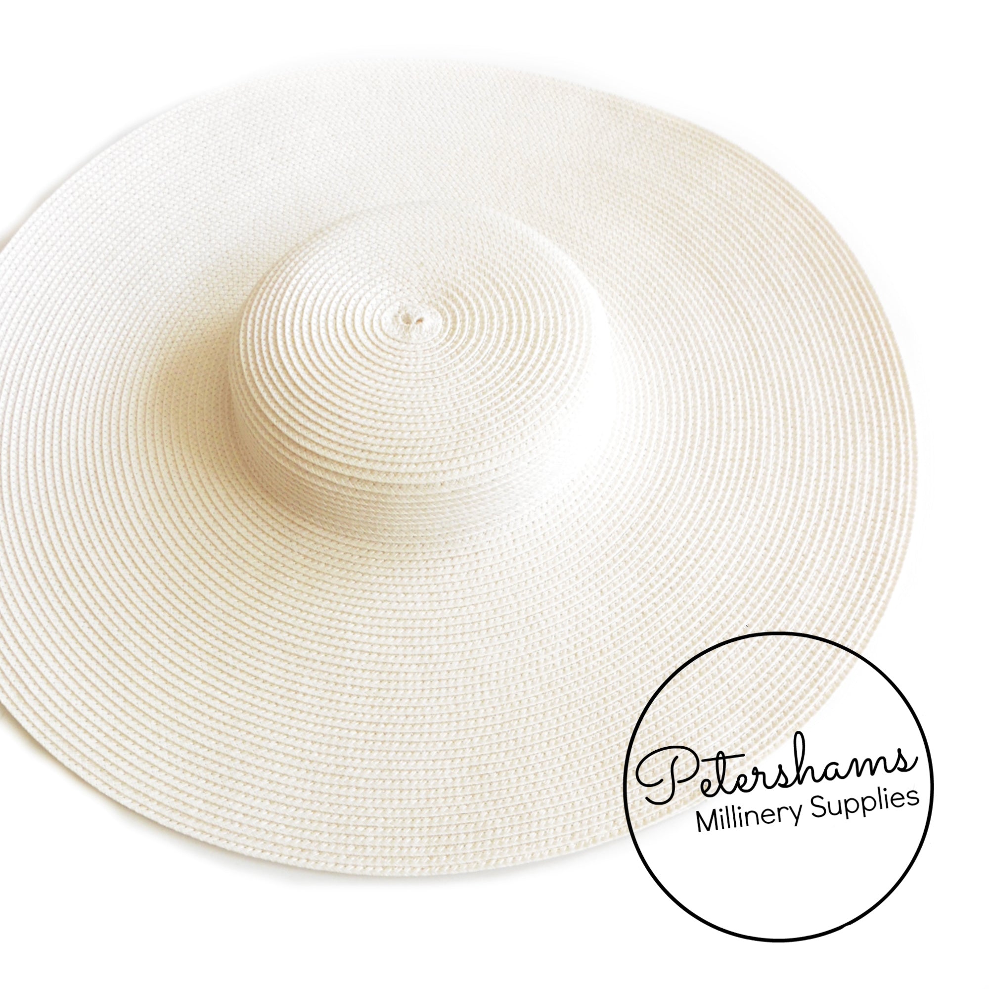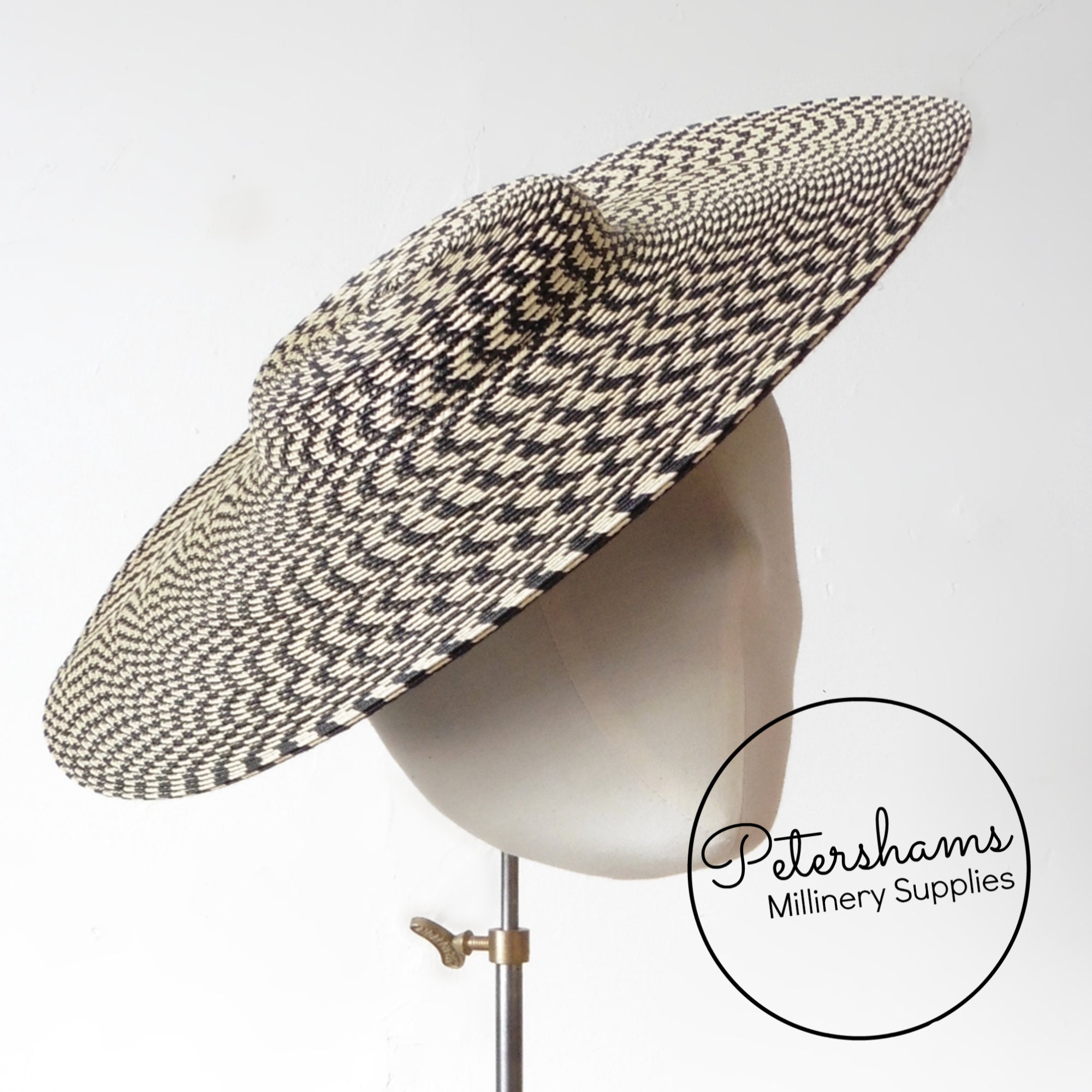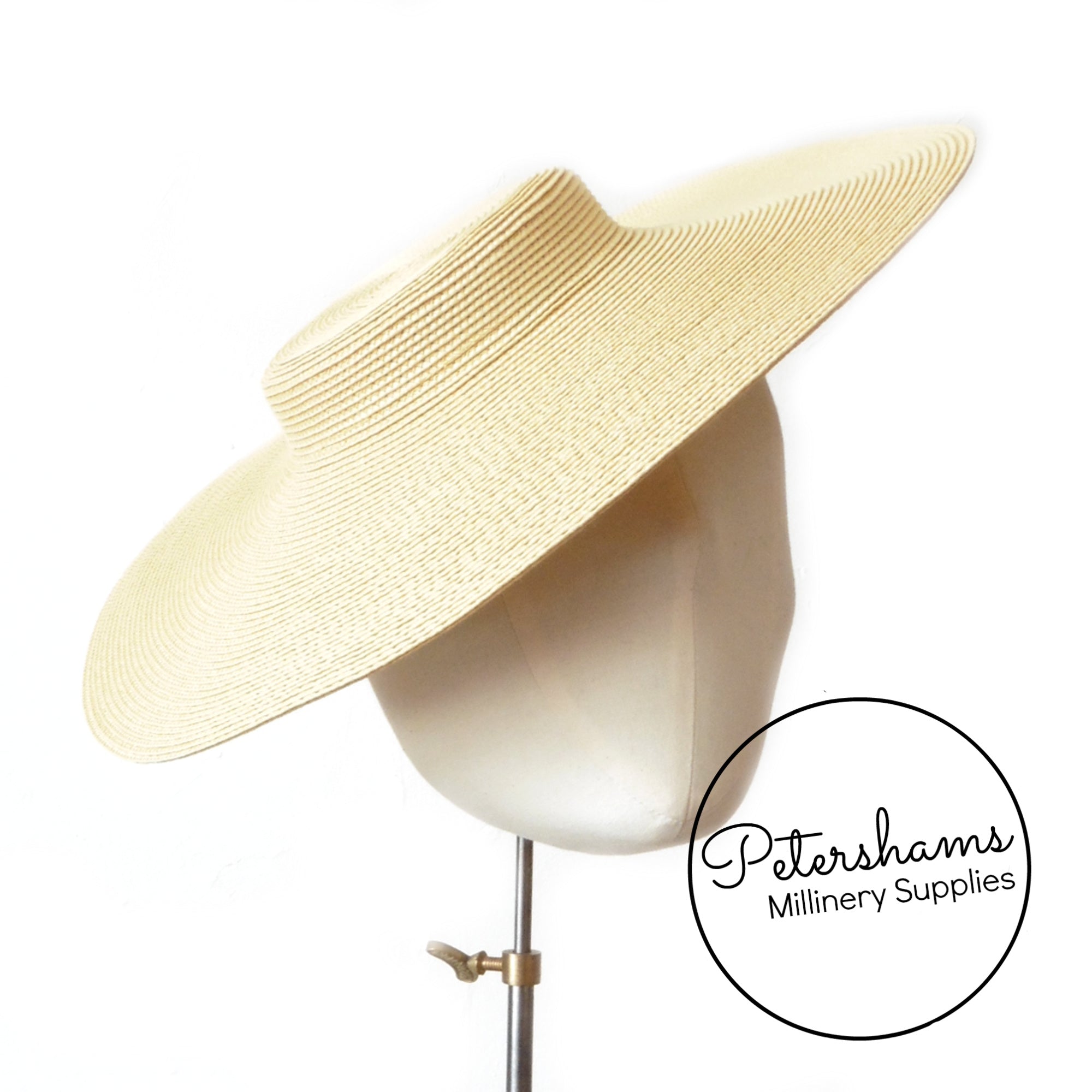 This cartwheel hat base is a classic shape that has sprung into popularity in the past year. Made from polybraid that has been spiraled and blocked, it has a petersham ribbon sewn into the inside crown for stability.