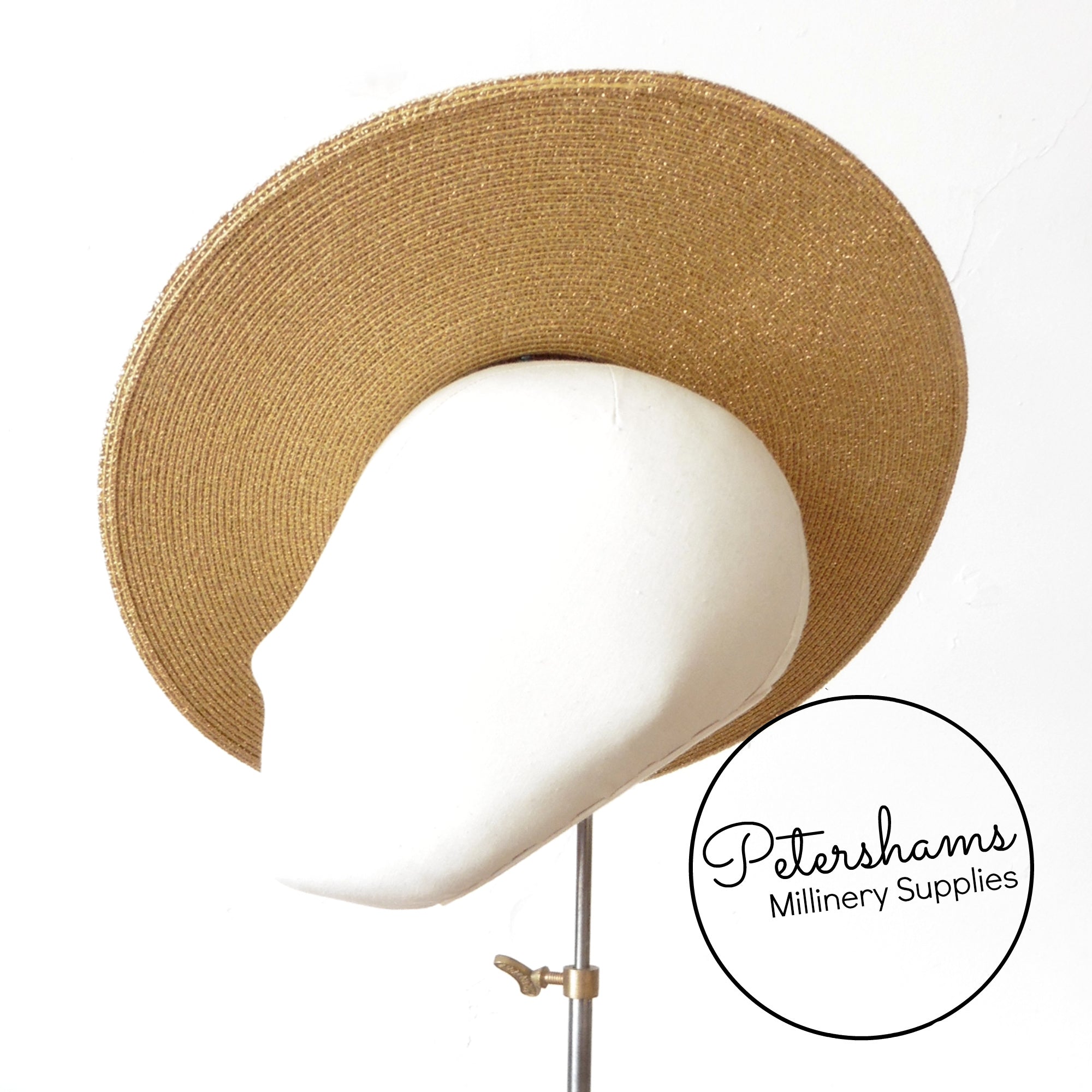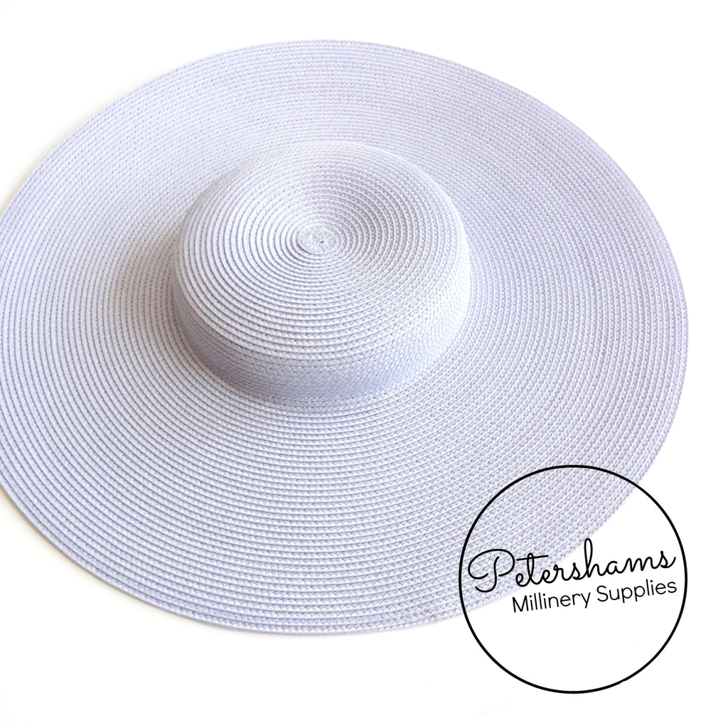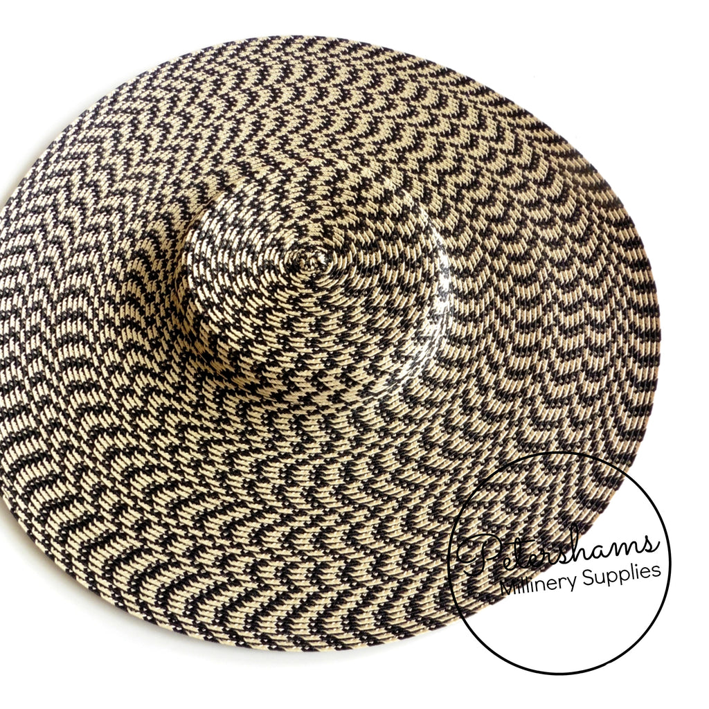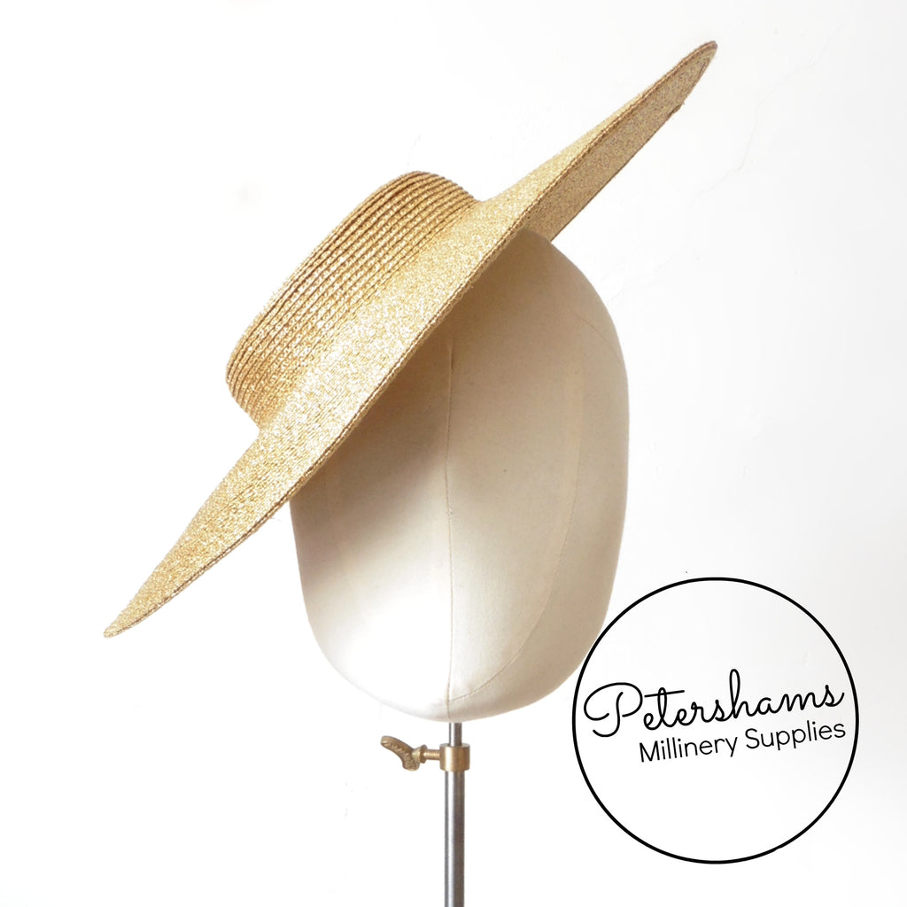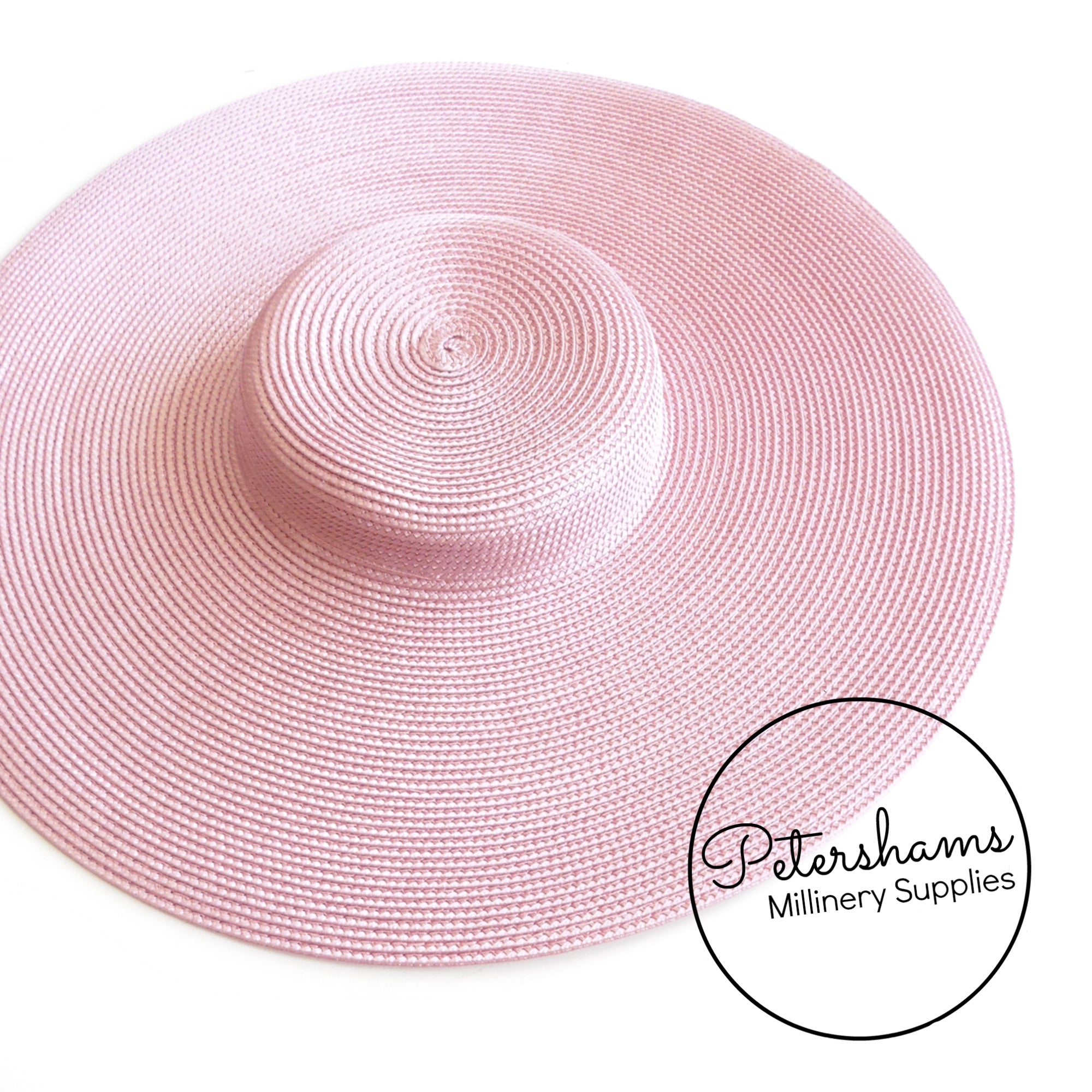 This cartwheel hat base is a classic shape that has sprung into popularity in the past year. Made from polybraid that has been spiraled and blocked, it has a petersham ribbon sewn into the inside crown for stability.