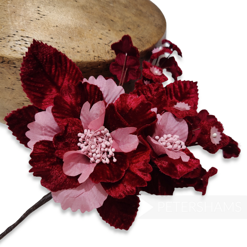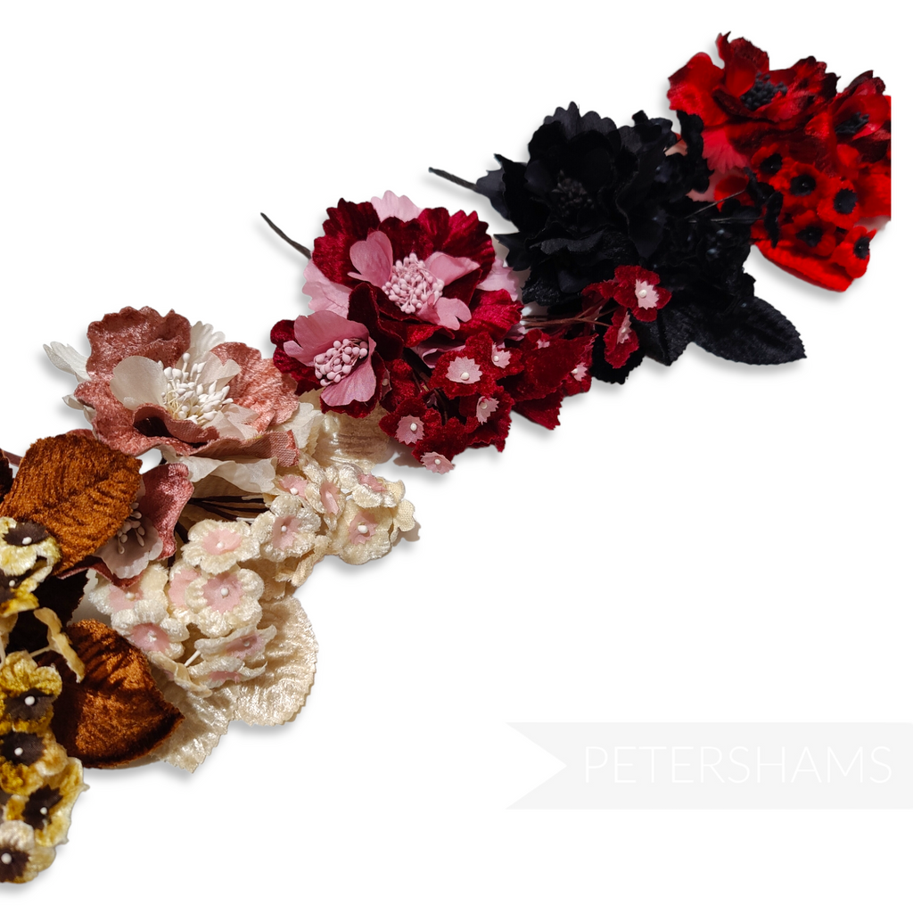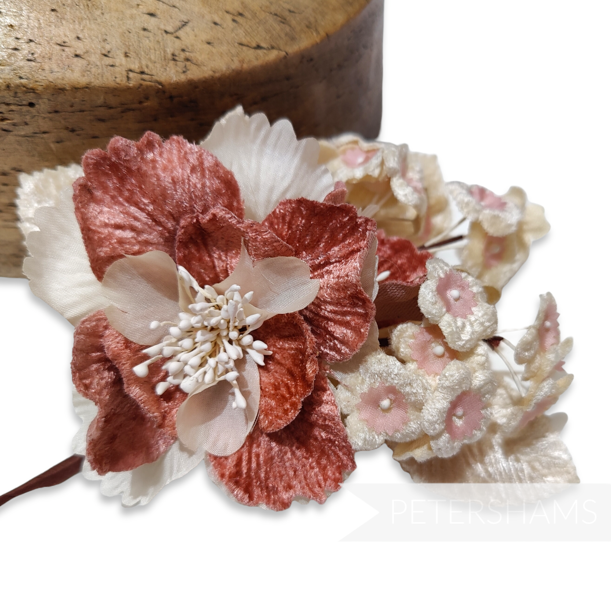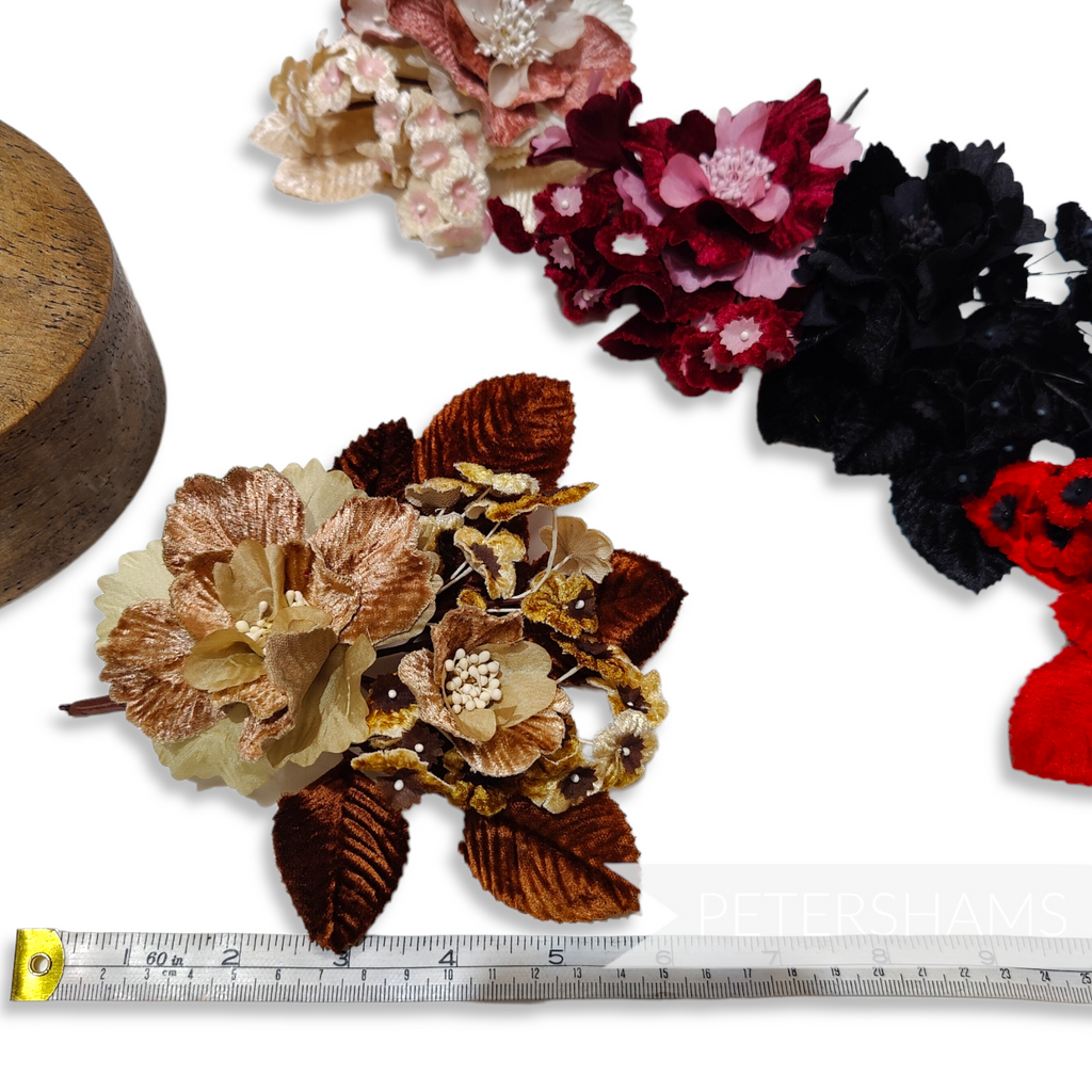 'Amoura' has got a little bit of everything! This wired hat mount features a large bloom at the mount base and is followed by a smaller blossom, several sprigs of mini blooms and is backed by three sets of wired leaves. It's fabulous quality and can be arranged to your design by bending it into position. Perfect for making instant headpieces or trimming up a winter hat!