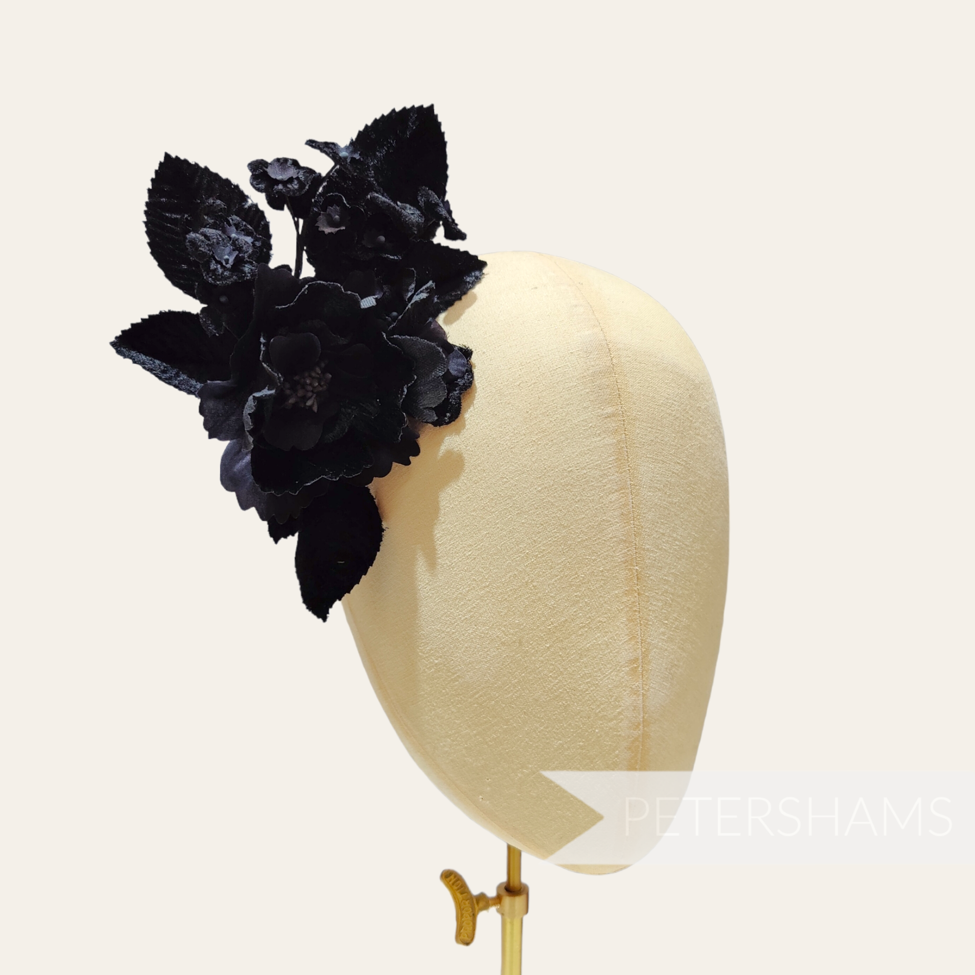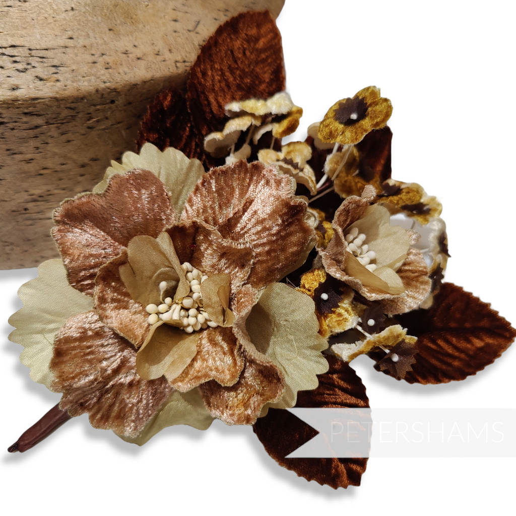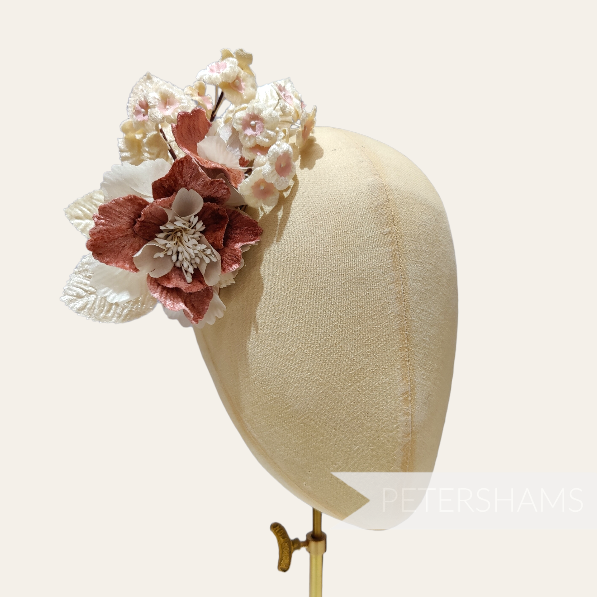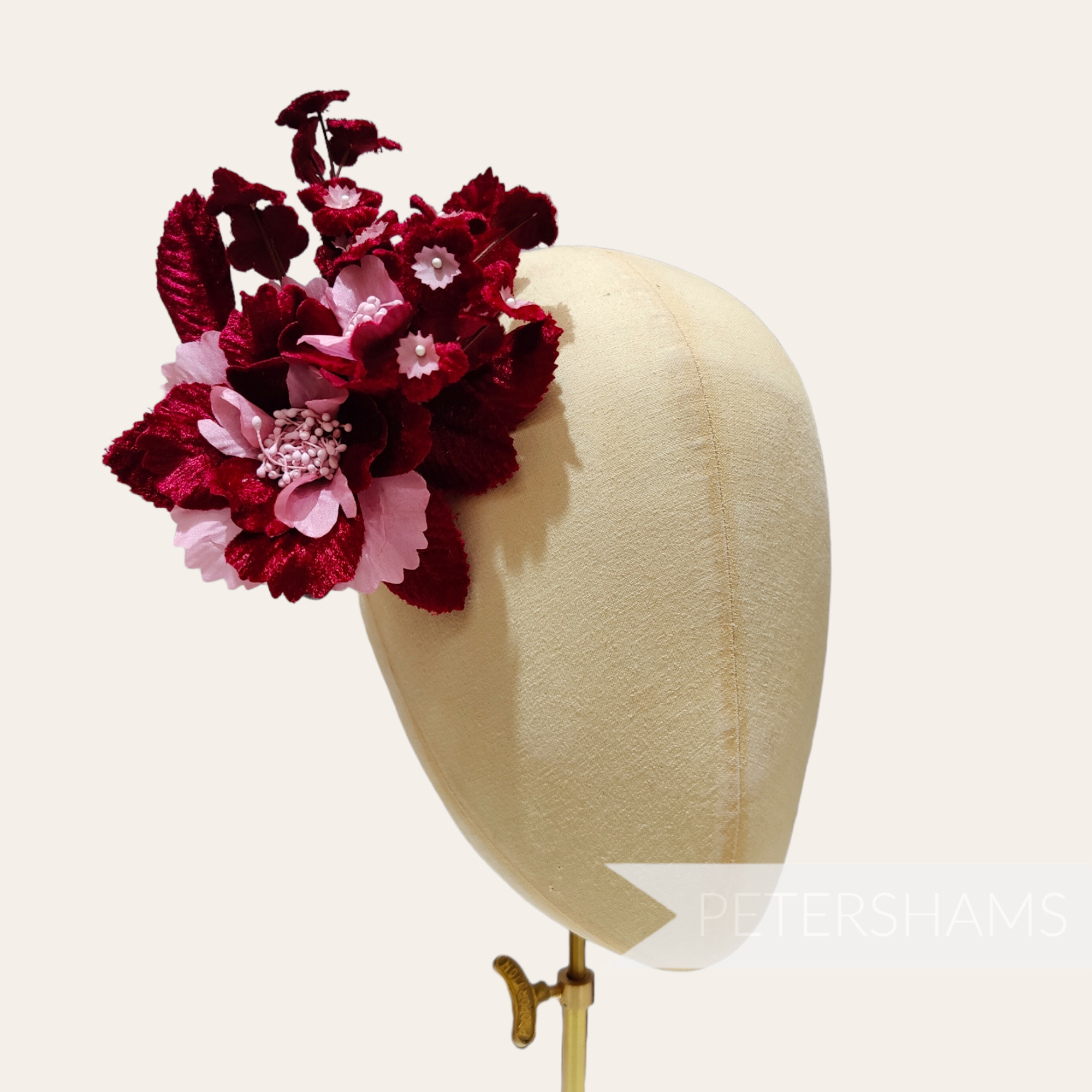 'Amoura' has got a little bit of everything! This wired hat mount features a large bloom at the mount base and is followed by a smaller blossom, several sprigs of mini blooms and is backed by three sets of wired leaves. It's fabulous quality and can be arranged to your design by bending it into position. Perfect for making instant headpieces or trimming up a winter hat!