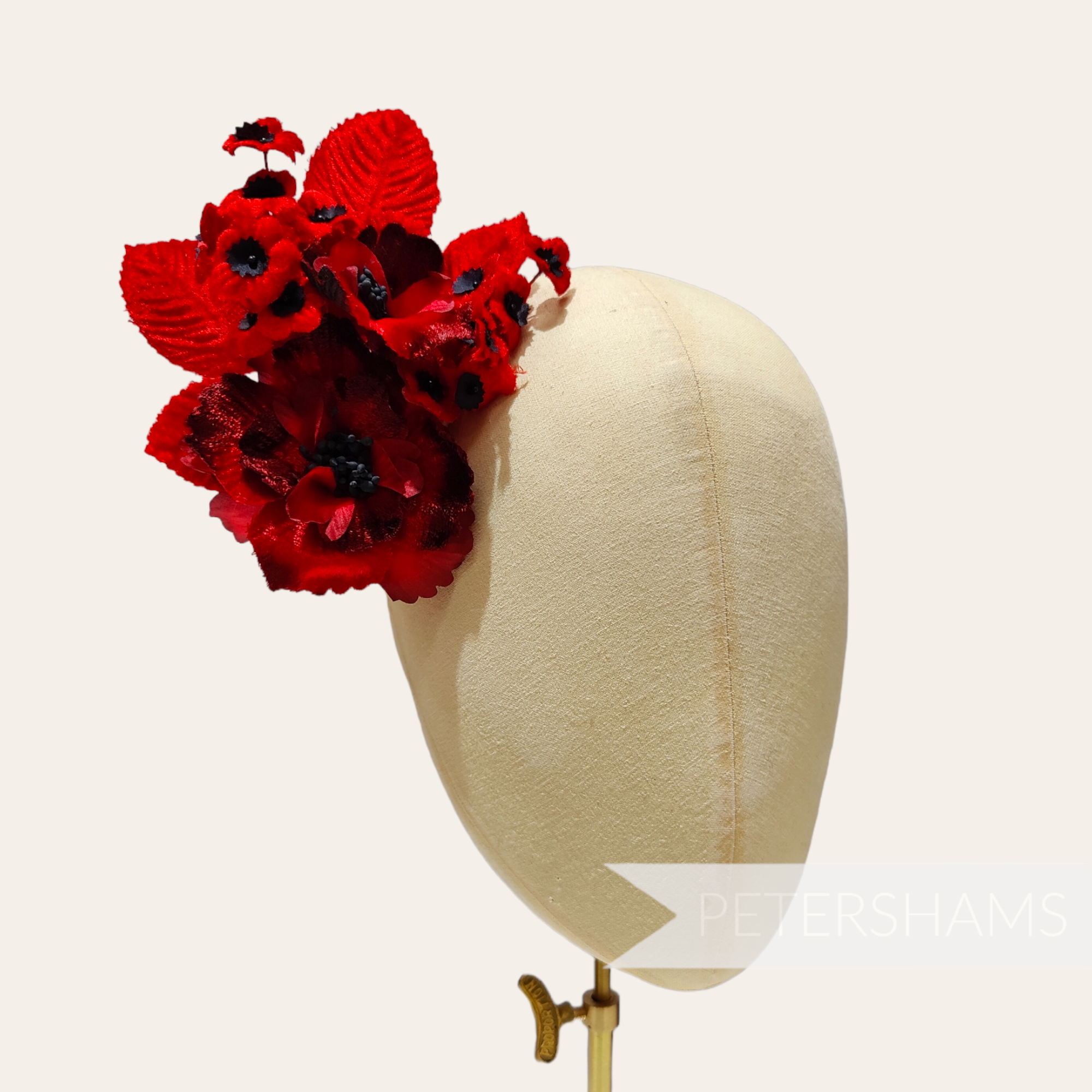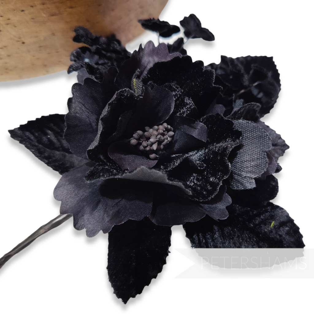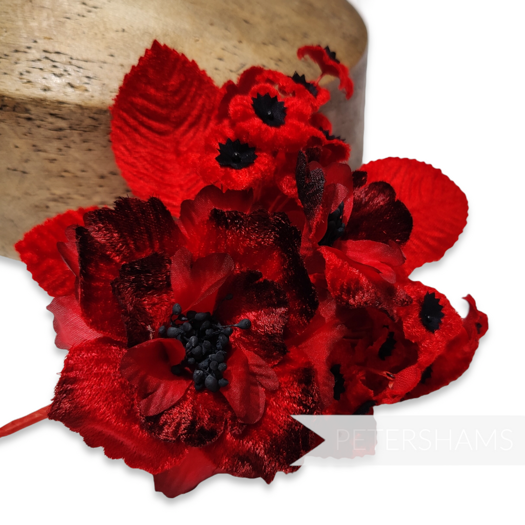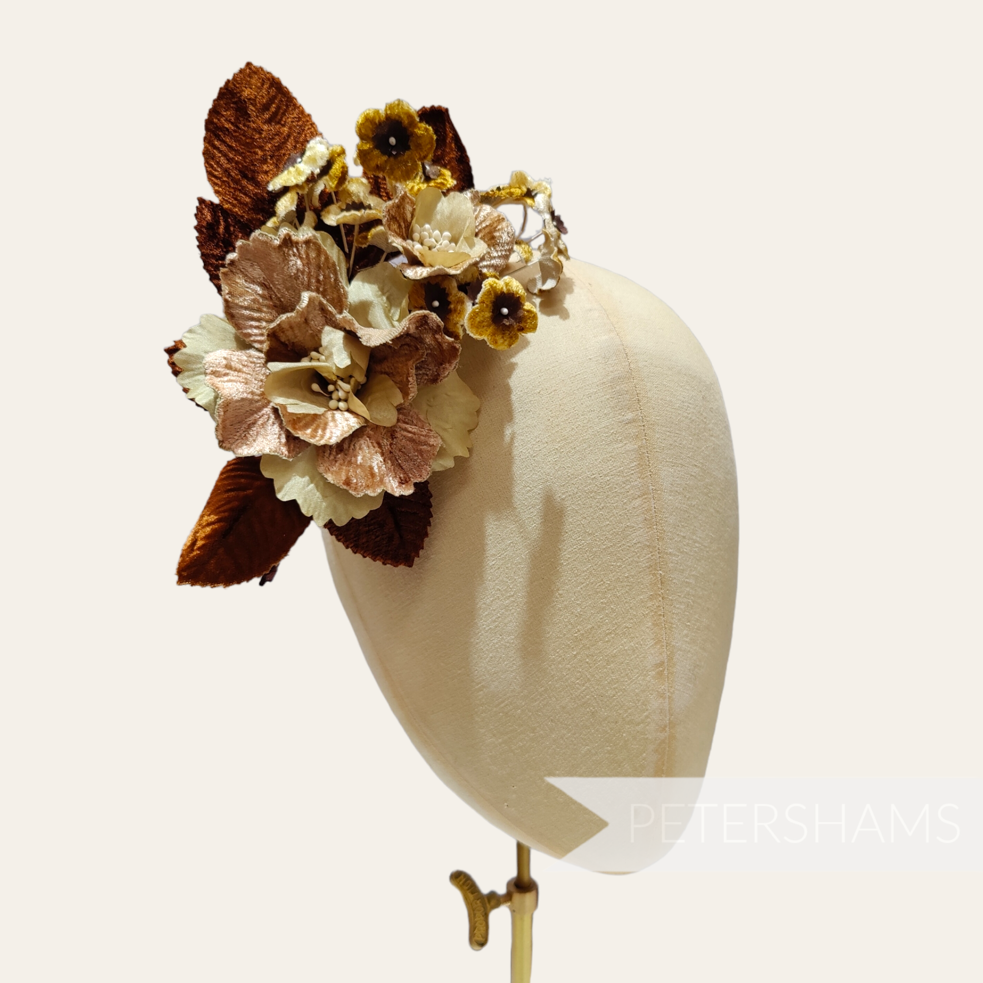 'Amoura' has got a little bit of everything! This wired hat mount features a large bloom at the mount base and is followed by a smaller blossom, several sprigs of mini blooms and is backed by three sets of wired leaves. It's fabulous quality and can be arranged to your design by bending it into position. Perfect for making instant headpieces or trimming up a winter hat!