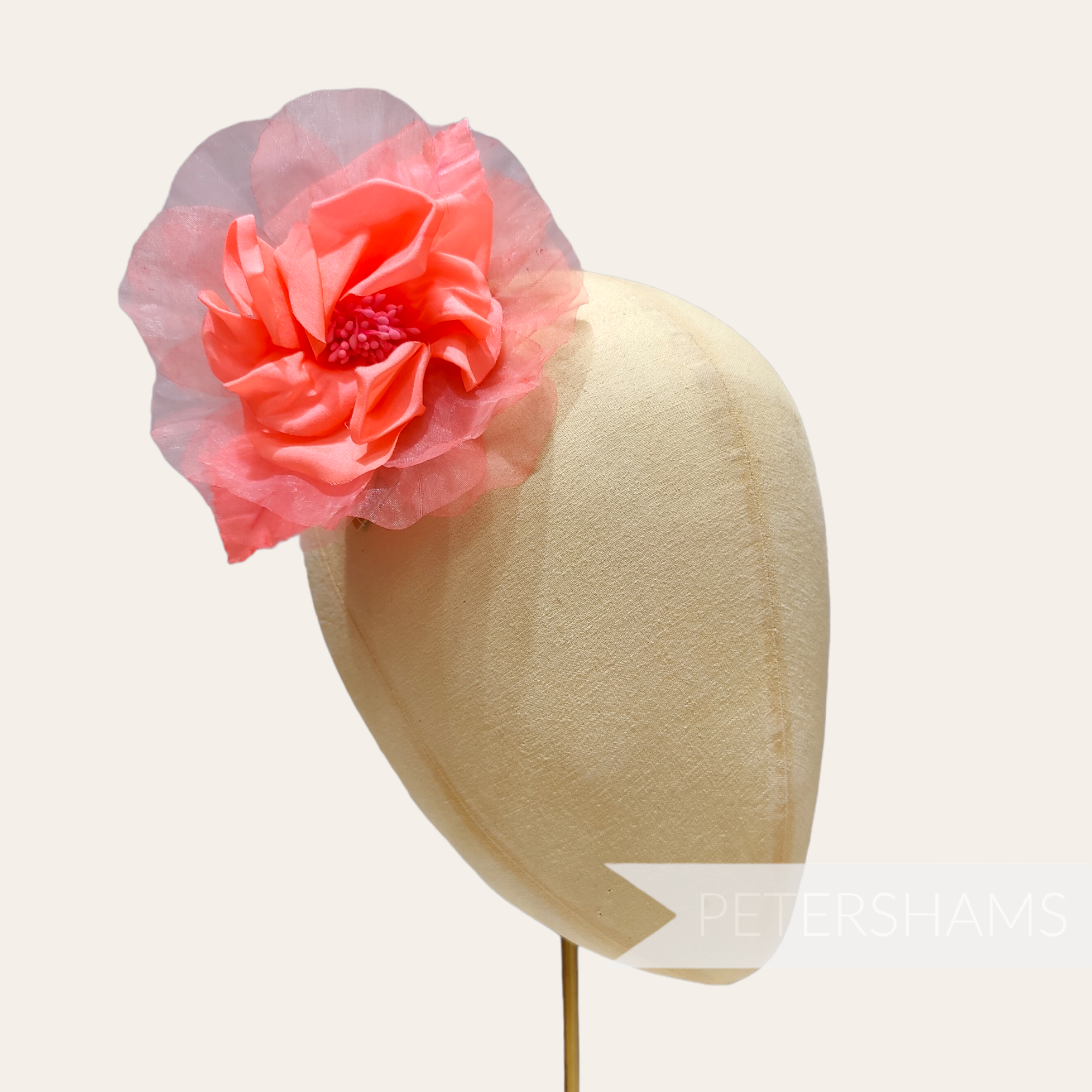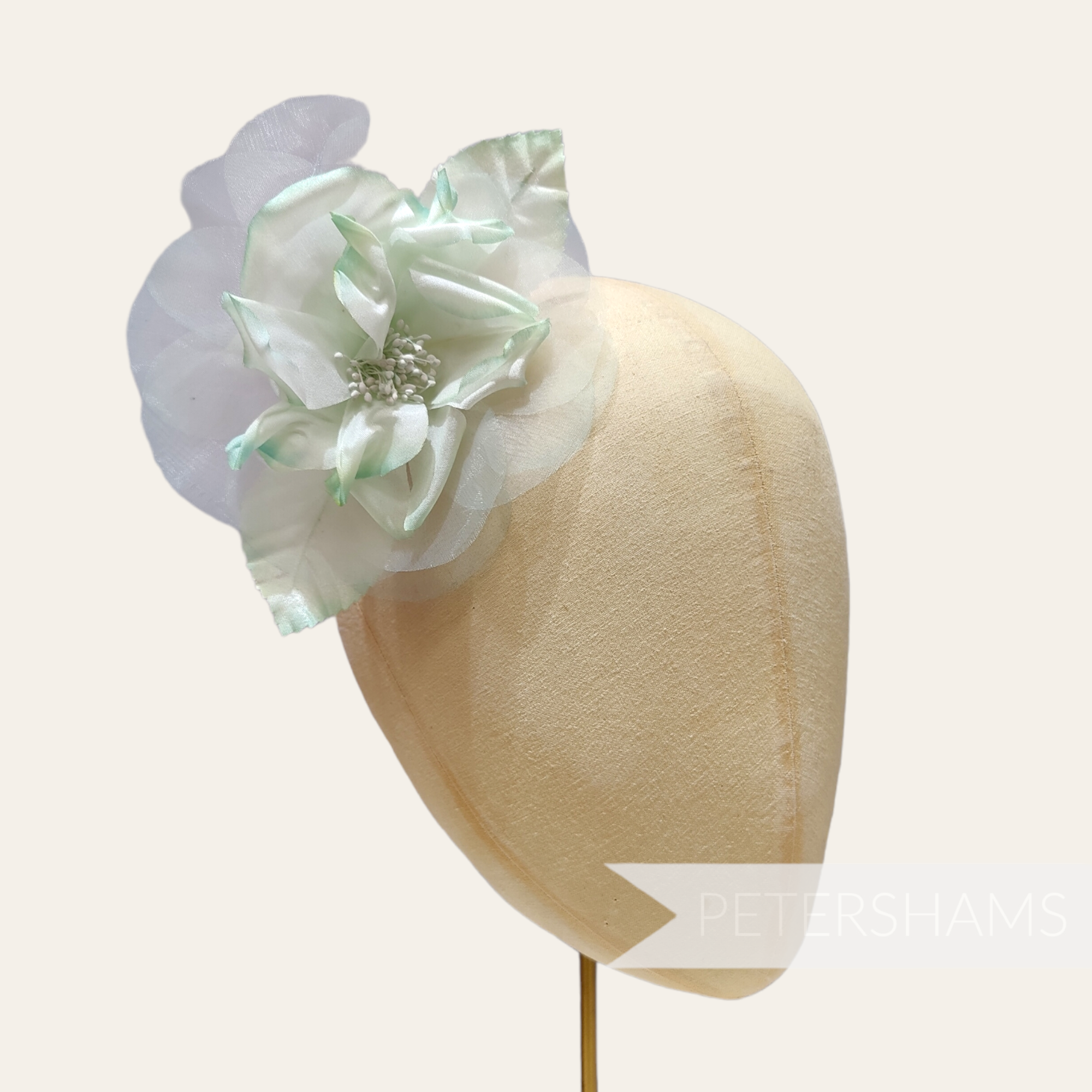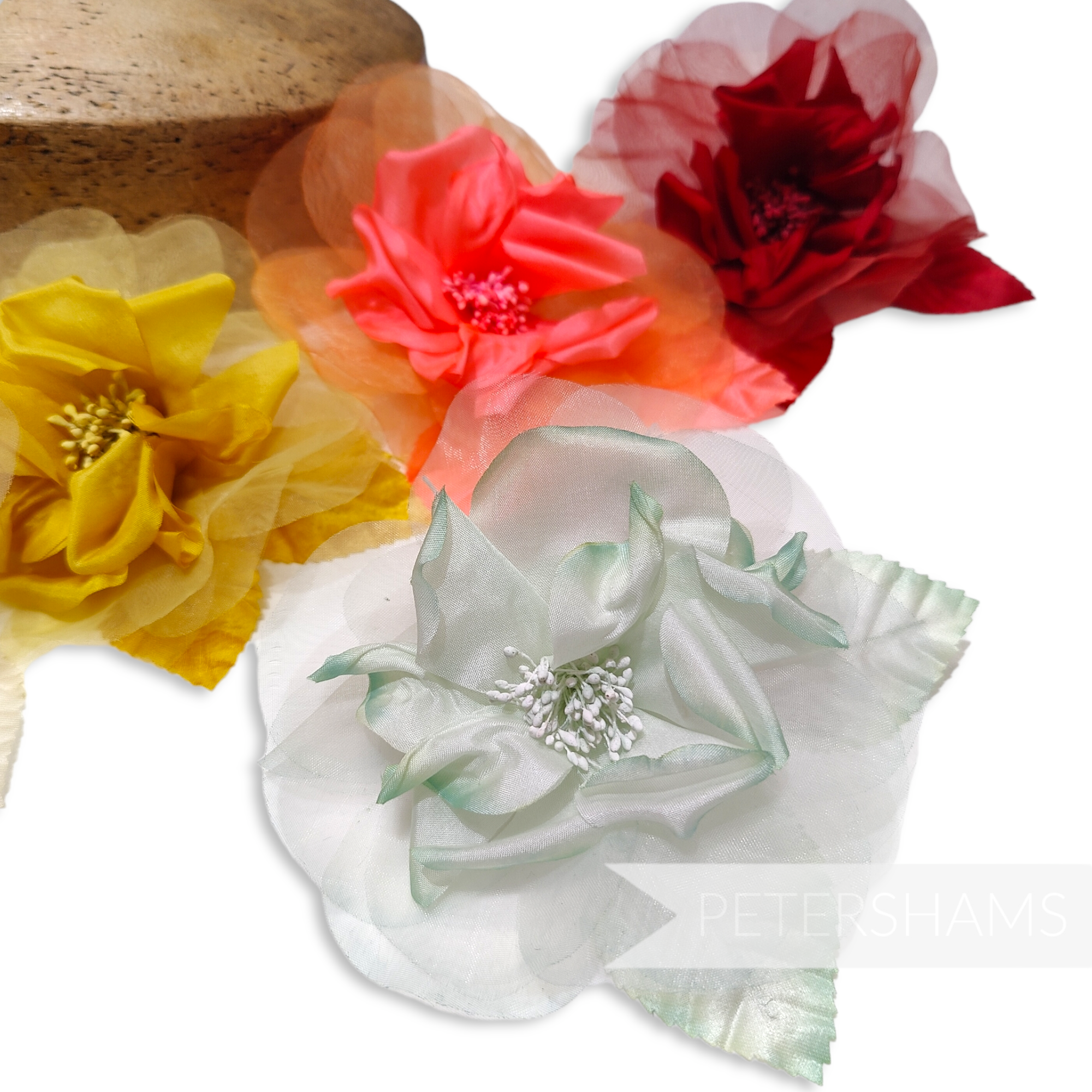 'Cleo' is a brilliant combination of silk and organza petals. At the flowers centre are layers of curled silk petals surrounded by sheer organza petals which extend the size of this flower without making it feel too heavy. It's wire stem means you can easily pop it onto a hat or headpiece and arrange how you please.