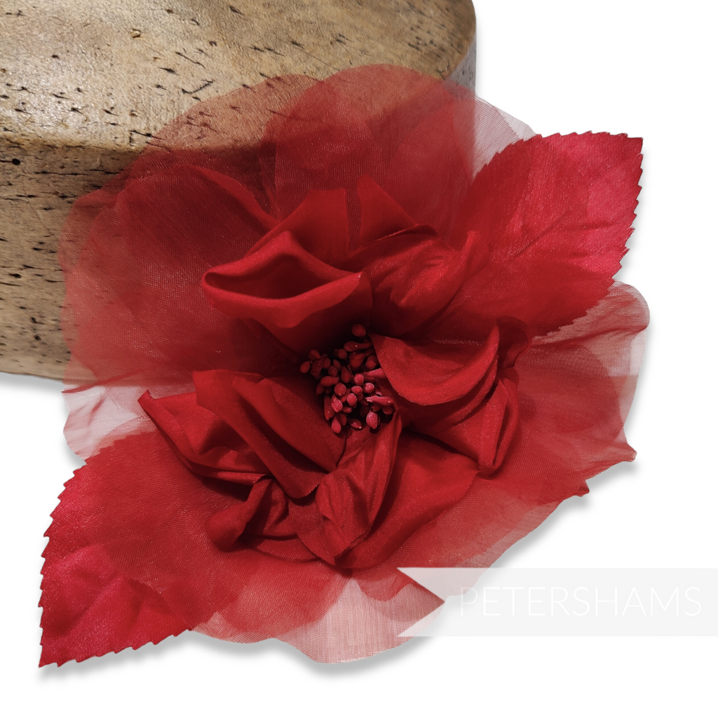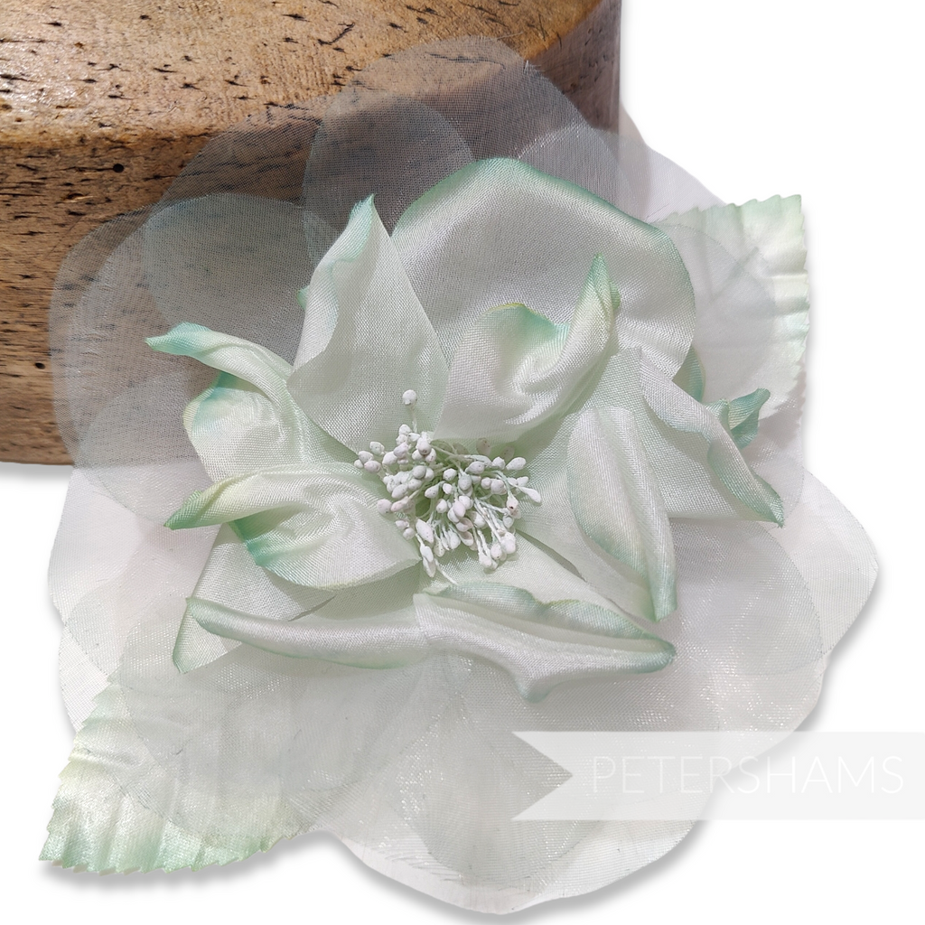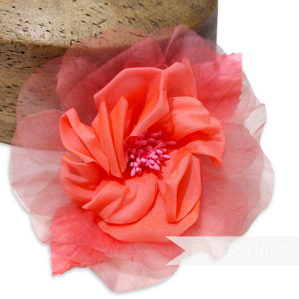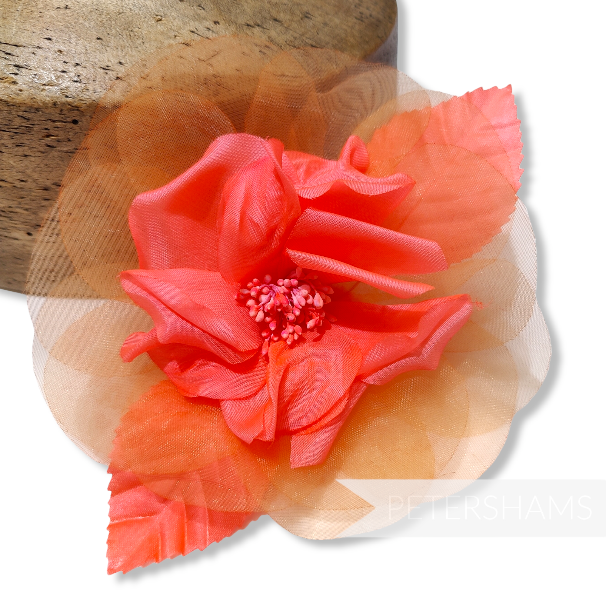 'Cleo' is a brilliant combination of silk and organza petals. At the flowers centre are layers of curled silk petals surrounded by sheer organza petals which extend the size of this flower without making it feel too heavy. It's wire stem means you can easily pop it onto a hat or headpiece and arrange how you please.