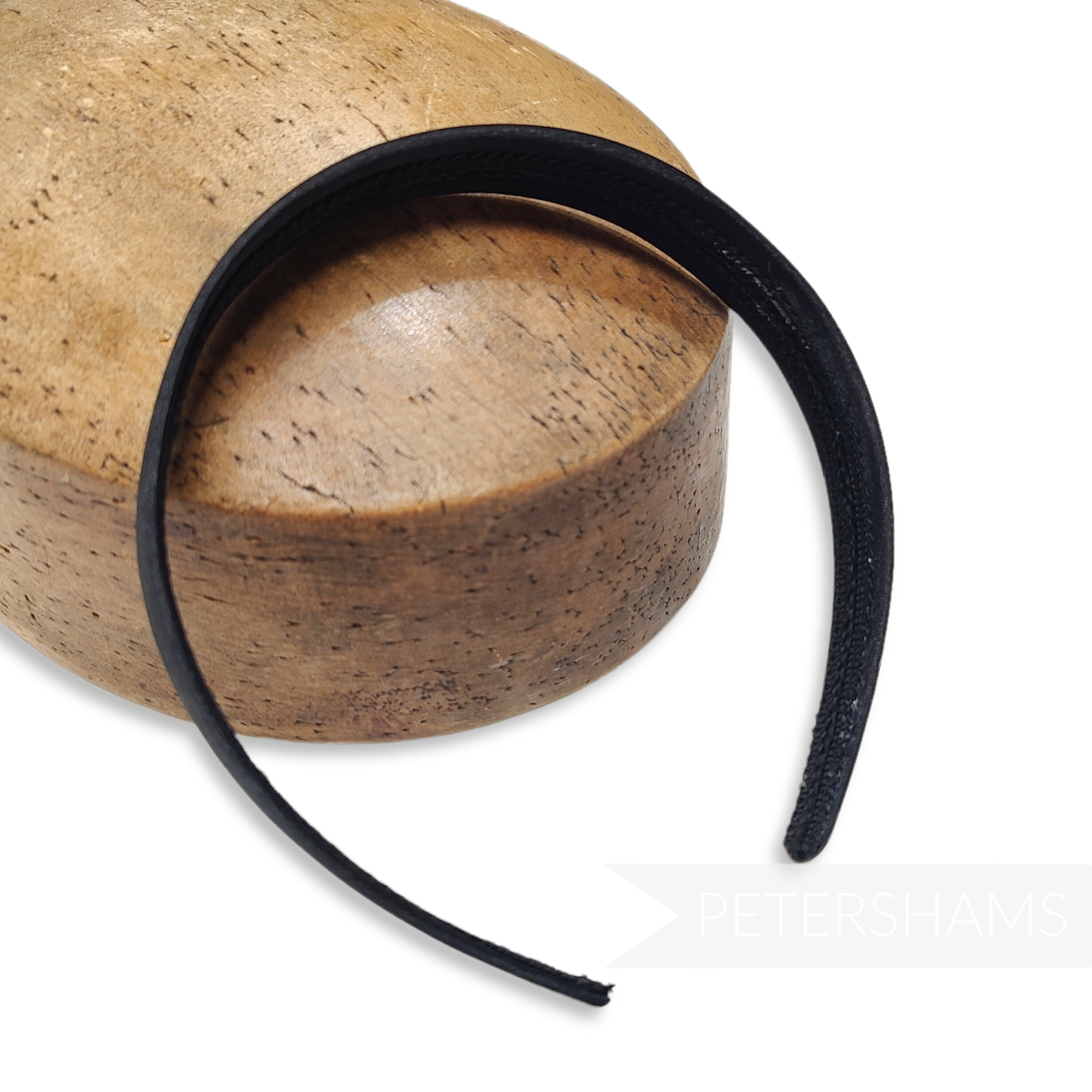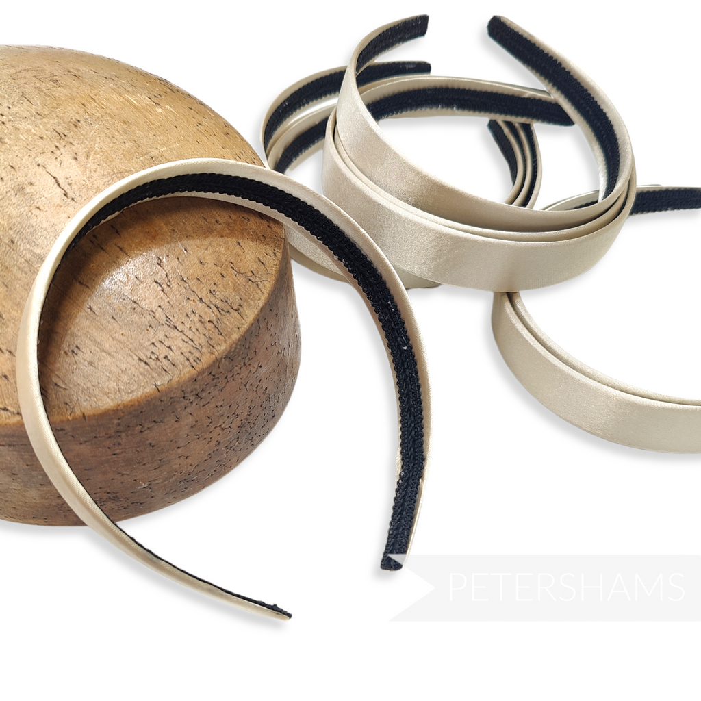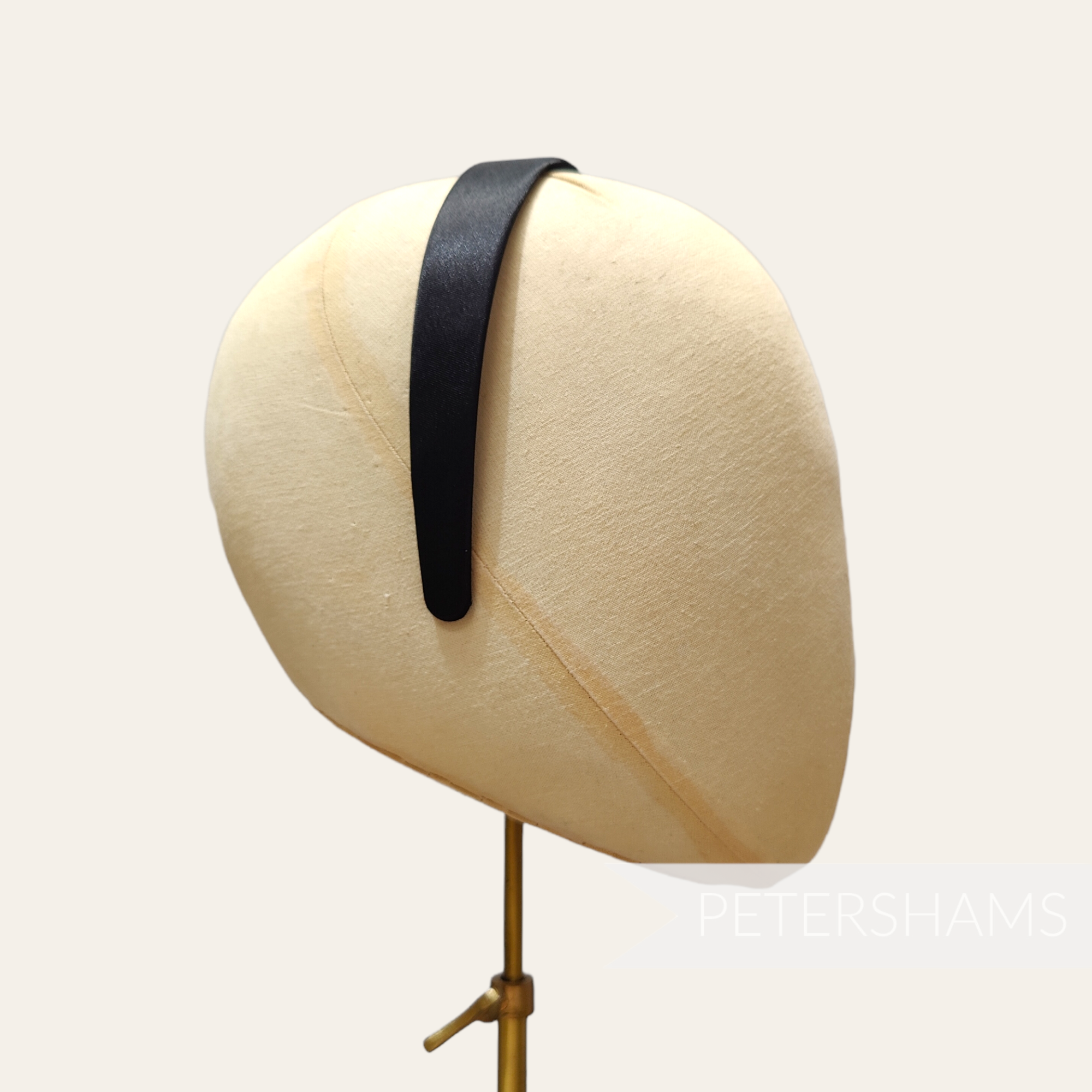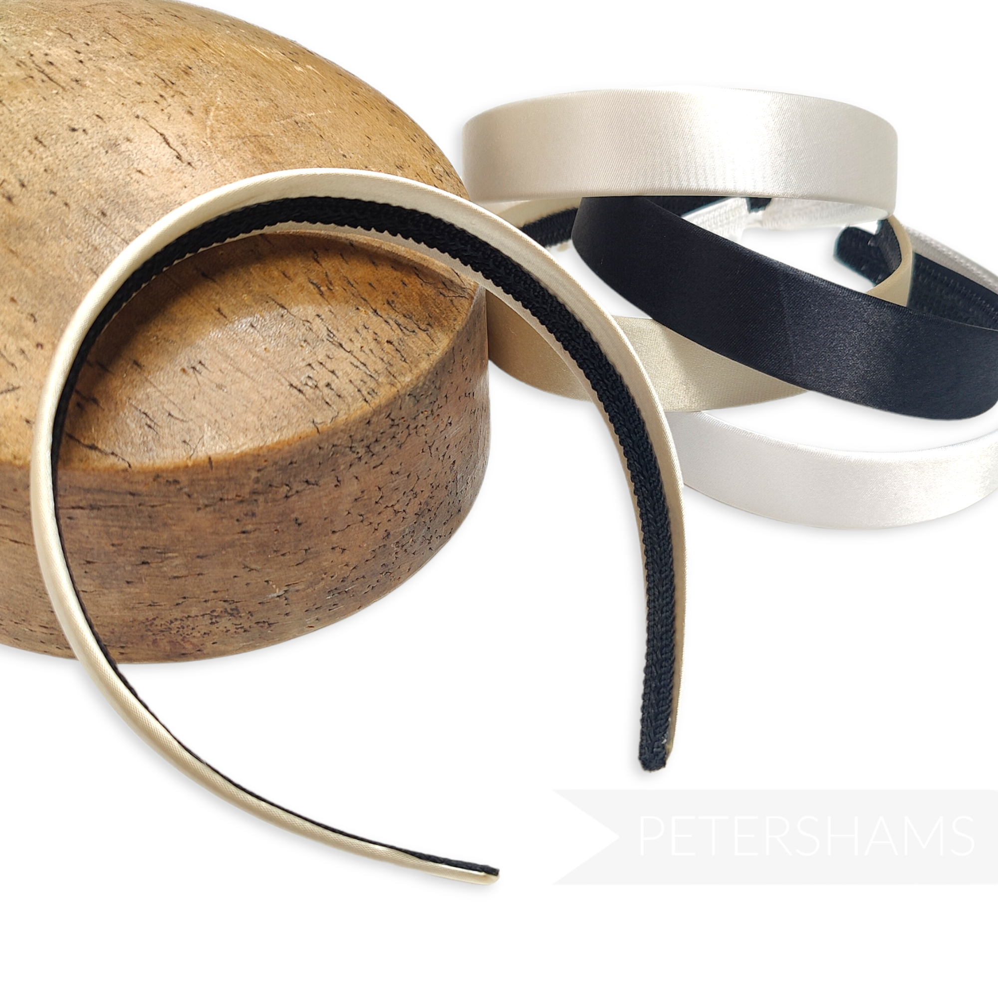 We have a new favourite headband! With a 24mm (.94 inch) wide flat base it is absolutely perfect for attaching to hats and fascinators that need to stay put. Better yet it has a plastic core which means it's not 'pinchy'.