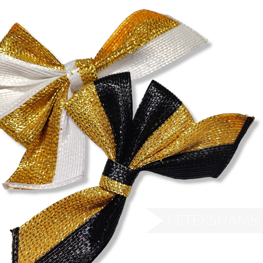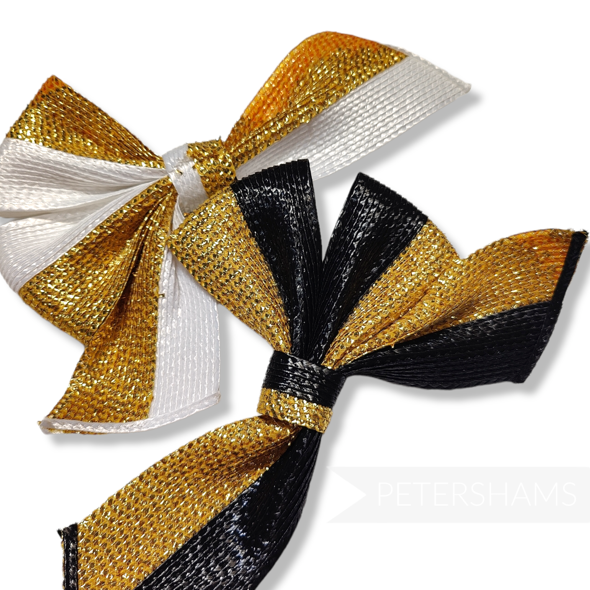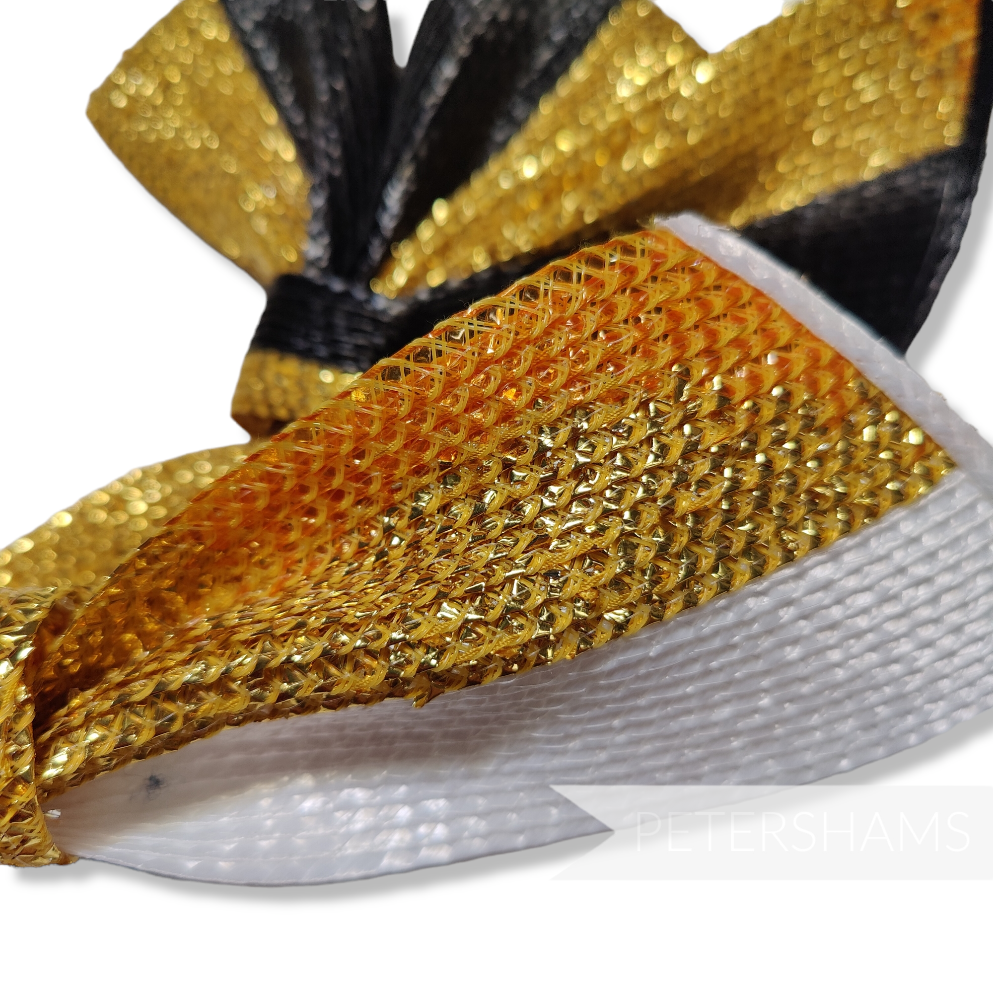 This stiff formed bow is made from glossy polybraid alongside metallic lurex threaded polybraid that has a gentle thread slub work in it. It's a fabulous shape that sits perfectly on the head. Simply pop onto a headband for an instant fix!