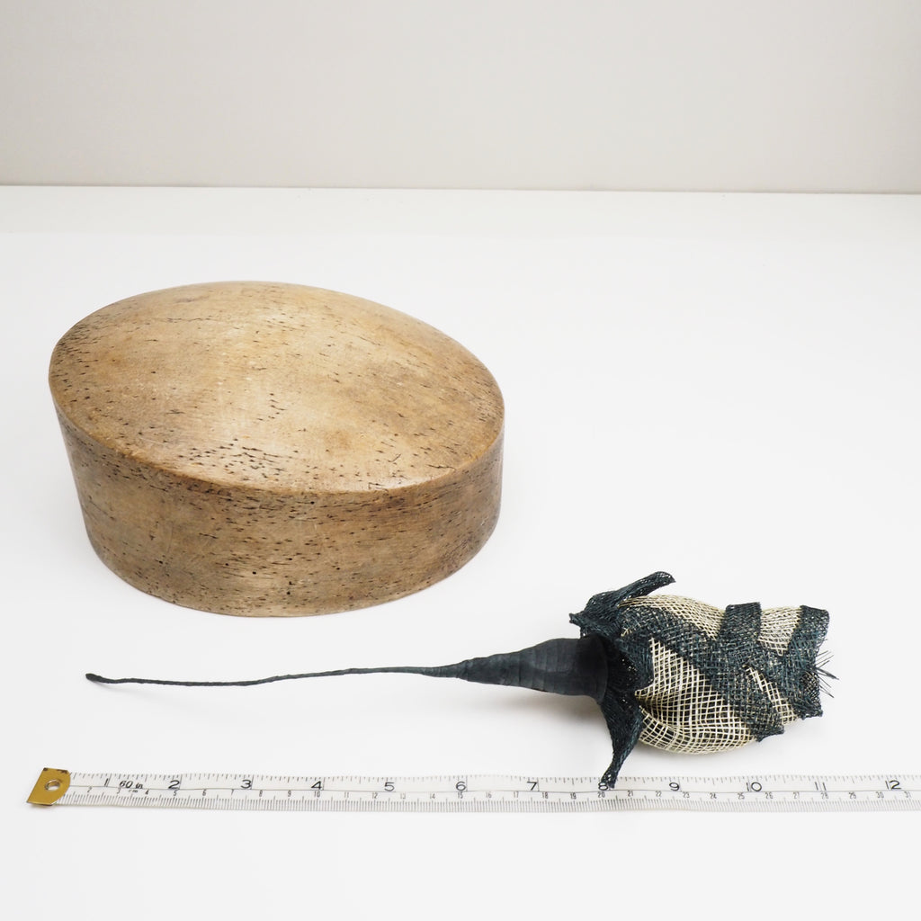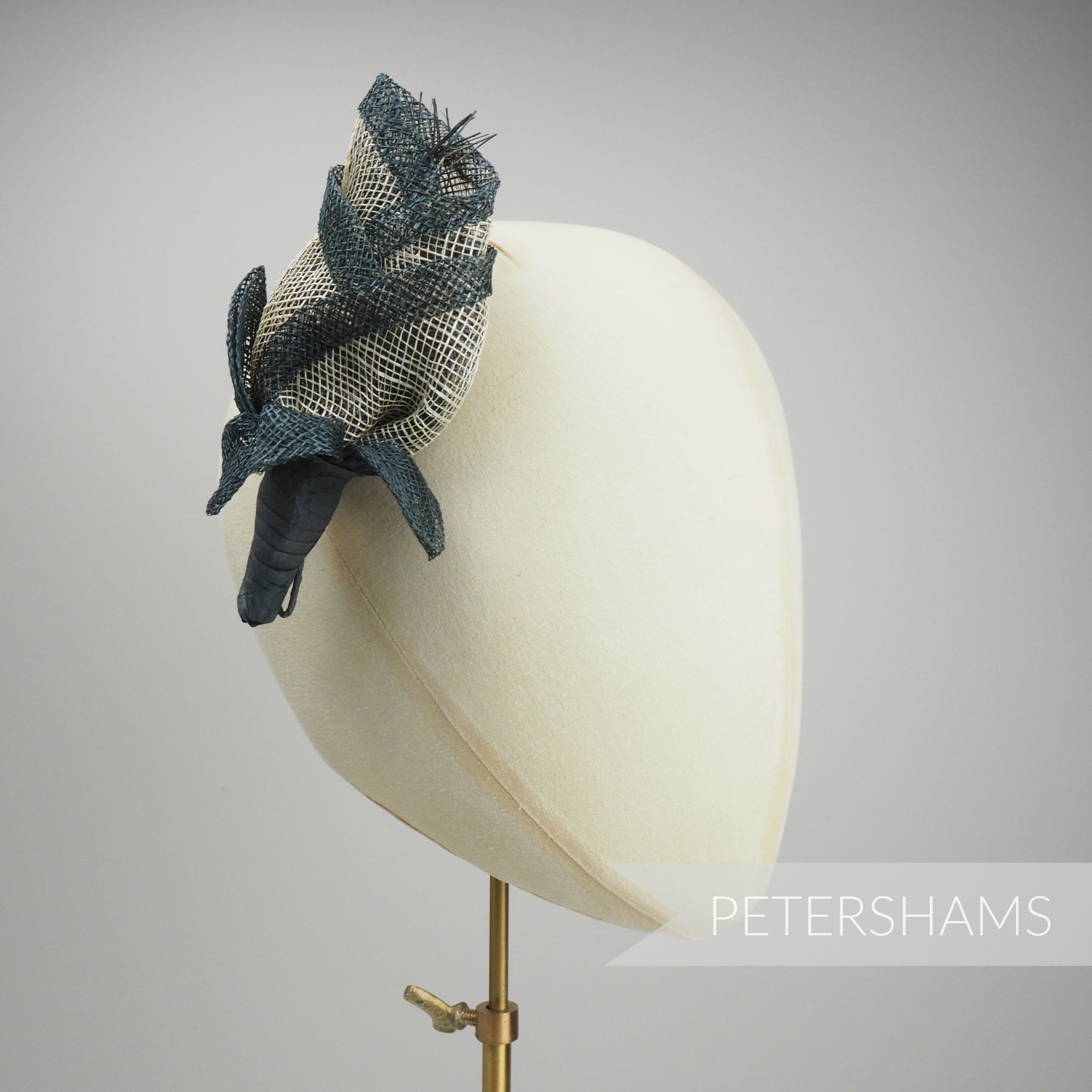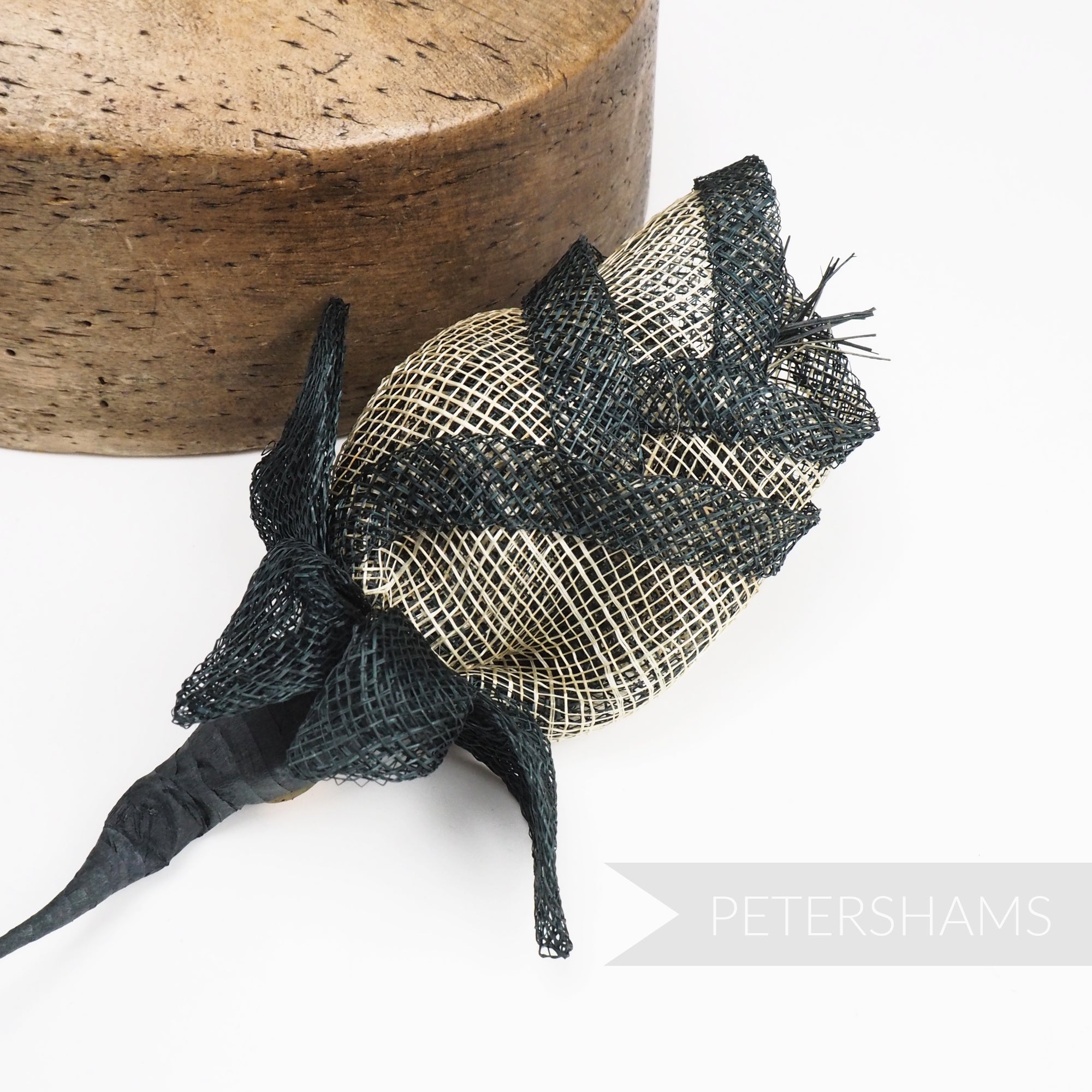 'Clara' is a plump rosebud hat flower made from handwoven sinamay formed into a rosebud complete with contrast edge petals, shaped leaves and straw stamens all attached to a wired stem.