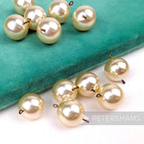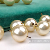 These faux pearls are large yet lightweight, champagne in colour and comes with a metal loop. We got them from a closed down jewellery manufacturer, so they are fab quality and their vintage status gives them extra sustainability points!