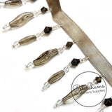 This beaded fringe features alternating lengths of interesting wavy beads that are topped with a conical accent bead spaced with seed beads all on a satin ribbon.