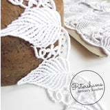 This extra large white guipure trim has a flowing leaf design and is coveted for bridal work as it can easily be chopped up and used as appliques without the risk of fraying. This larger size makes it ideal for bridal headdress as well!