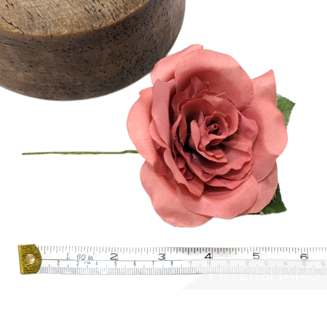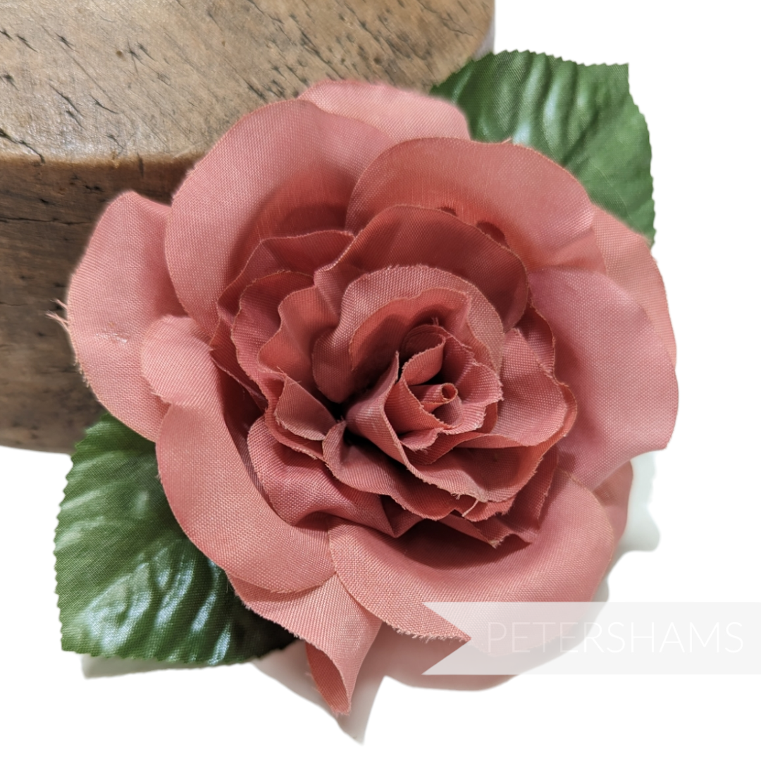 This small camellia flower is idea for smaller pieces as it has been delicately hand-made with layers and layers of fabric, and backed by two green wired leaves. The flower is on a wired stem so you can shape it as you please, perhaps even group a few of them together!