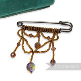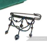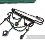 This pretty gunmetal colour kilt pin has been decked out with an absolute ton of seed beads draped into various swags with faceted beads dangling at the bottom. It would maker a perfect addition for adding onto the side crown of a hat or simply worn as a decorative brooch.