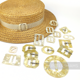 A whopping collection of 25 cream pearlized effect plastic and mother of pearl buckles. Some have slight damage, but on the whole this is an amazing group of gorgeous hat trims!