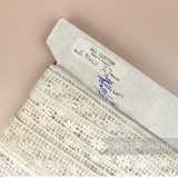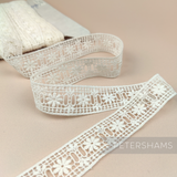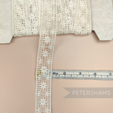 Ribbon slot lace does just that, providing a space to slot through this pretty grid flower patterned lace. This particular lace will accommodate approximately a 6-7mm ribbon. Dating to the 1950s/60s, this ribbon has been made in England.