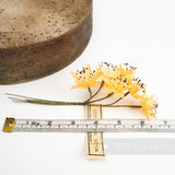 Dating to the 1950's, these petite silk flowers were made in German in the 1950's and are a lovely bright peach colour with burgundy tipped stamens and green paper wrapped wired stems. This mount has 6 flowers which you can use individually.