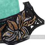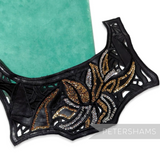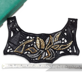 This one takes us back! This extra large motif is made from cut-out embroidered black pleather and is topped with both metallic gold and silver sequins in a sort of tropical floral moment - honestly it is everything that we love about the late 80s / early 90s!