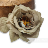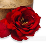 'Lucille' is a perfectly sized rose that has loads and loads of suede effect cloth petals and large cluster of stamens making up this super lush flower! There is also three wired leaves at the back, all attached to a central wired stem.