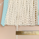 Guipure lace is well known for its 3D quality and can often be spotted in bridal work. This vintage variety dates to the 1950/60s and has been made in Austria. This design features a small simple flower spaced with small 'o's.