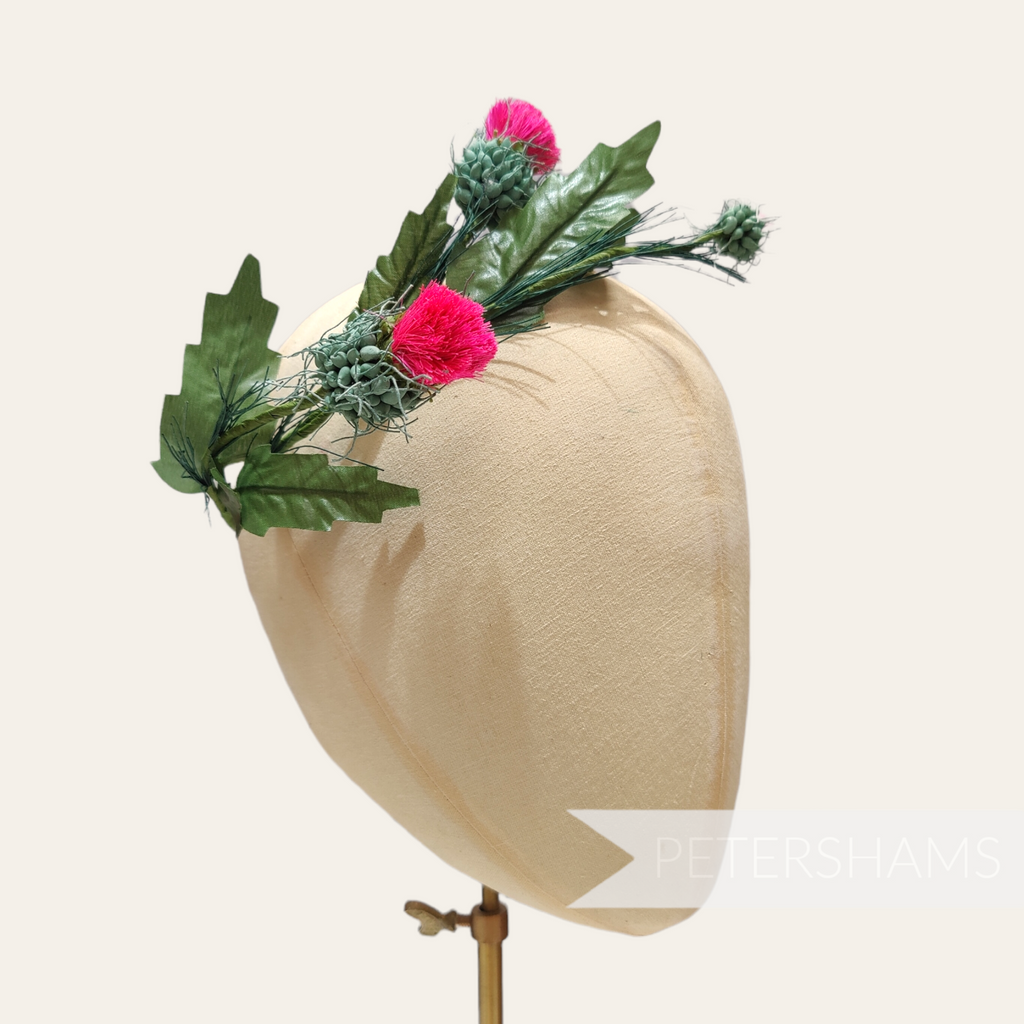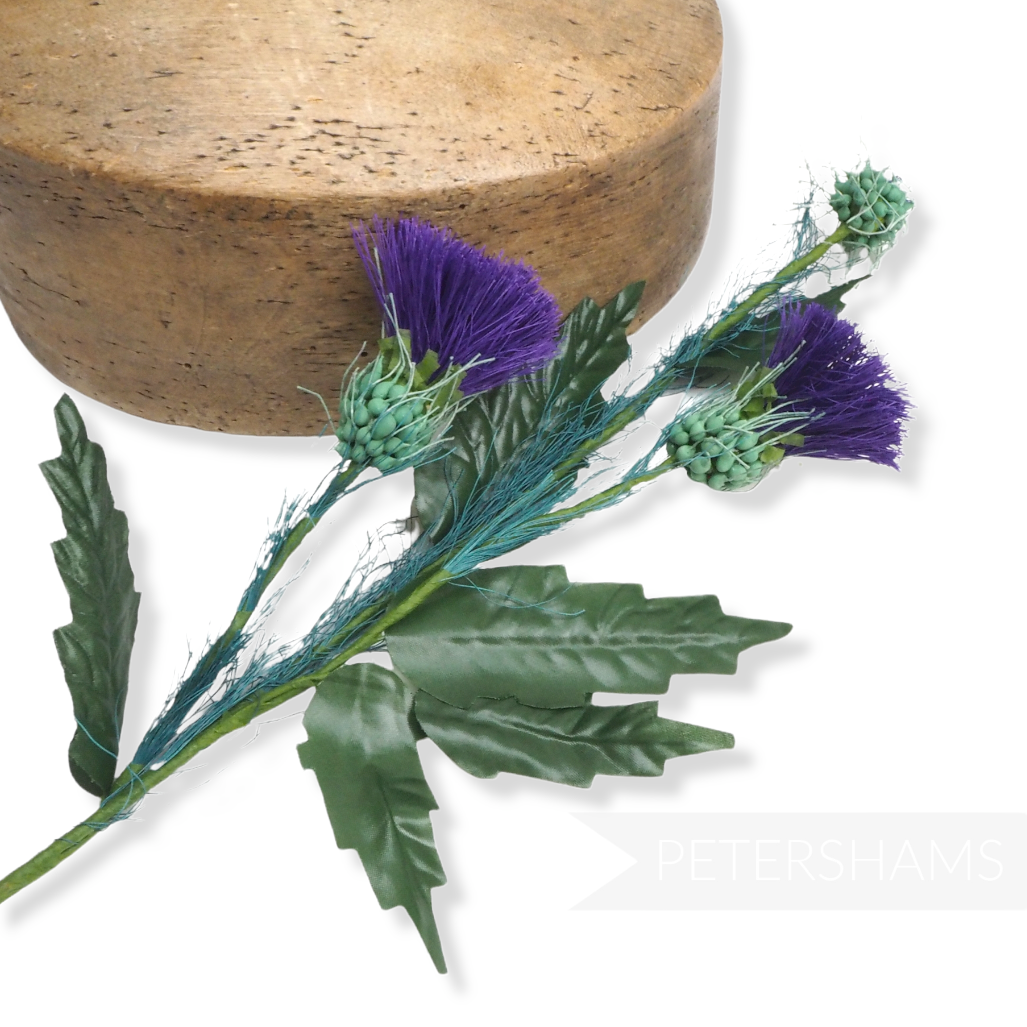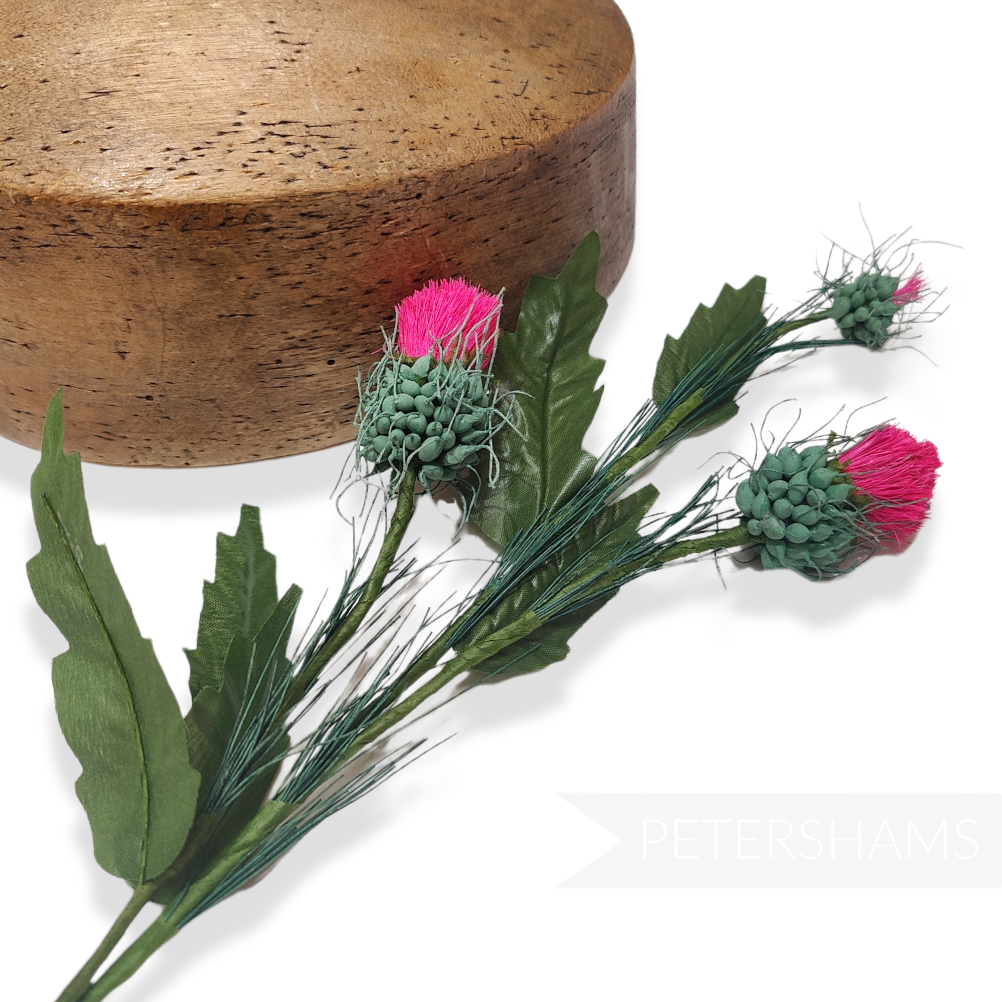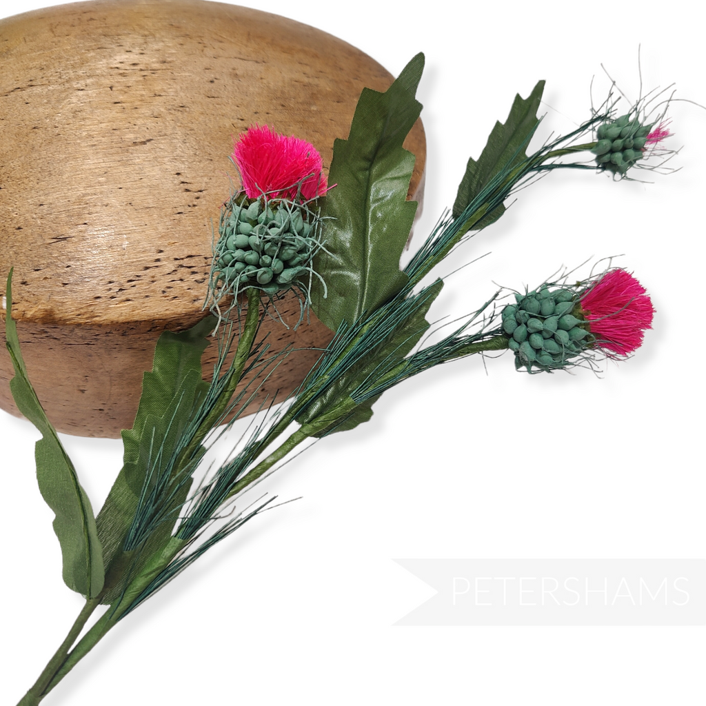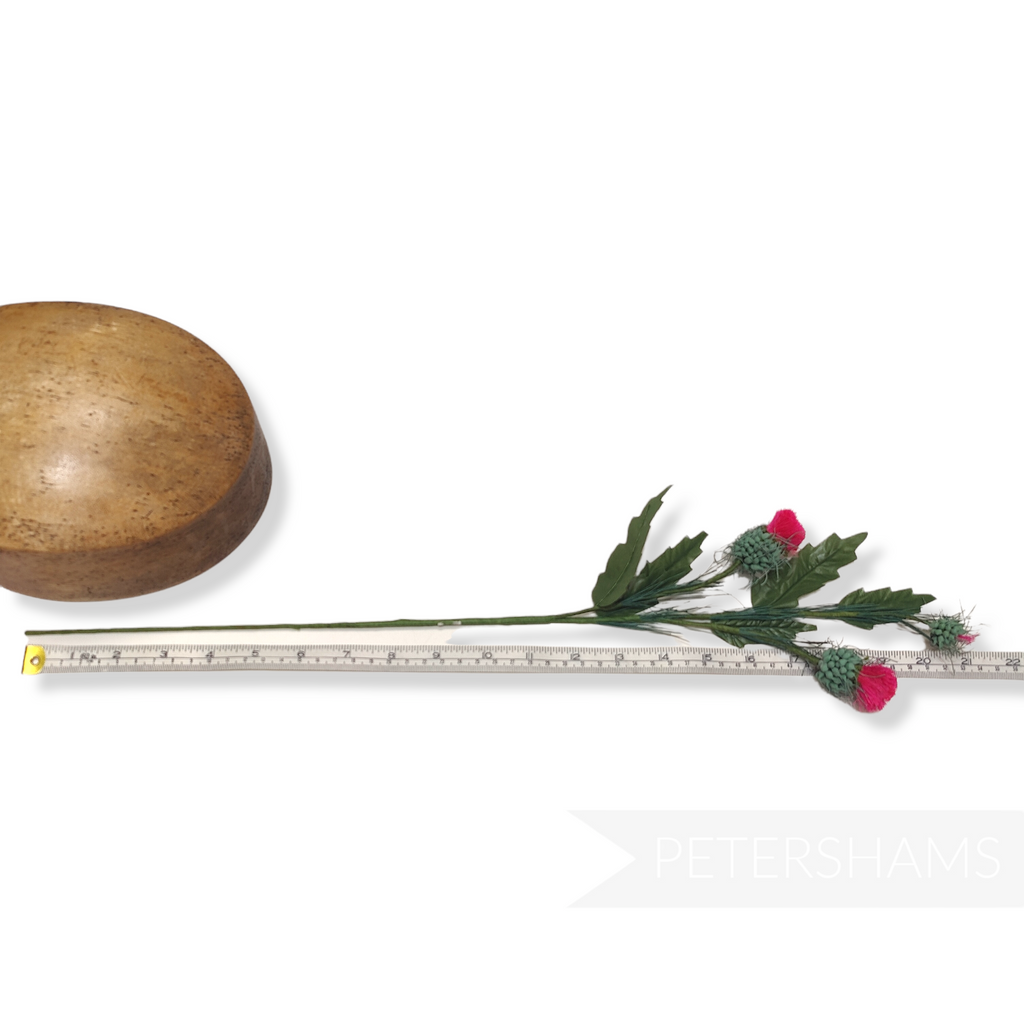 These thistles are just crying out to be made into gorgeous headdresses! The long stemmed thistles feature three colourful blooms and are adorned by silk leaves and little whisps of straw. The flower buds themselves are even made up of a thick bundle of fine straw strands!