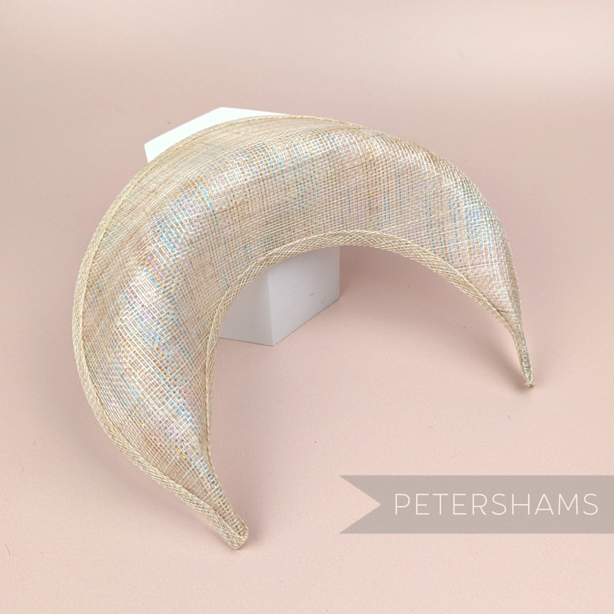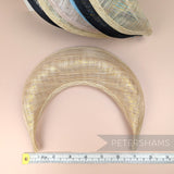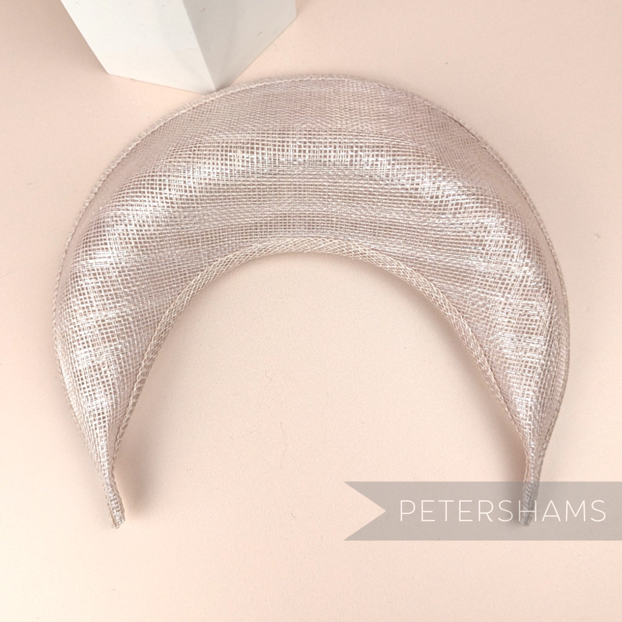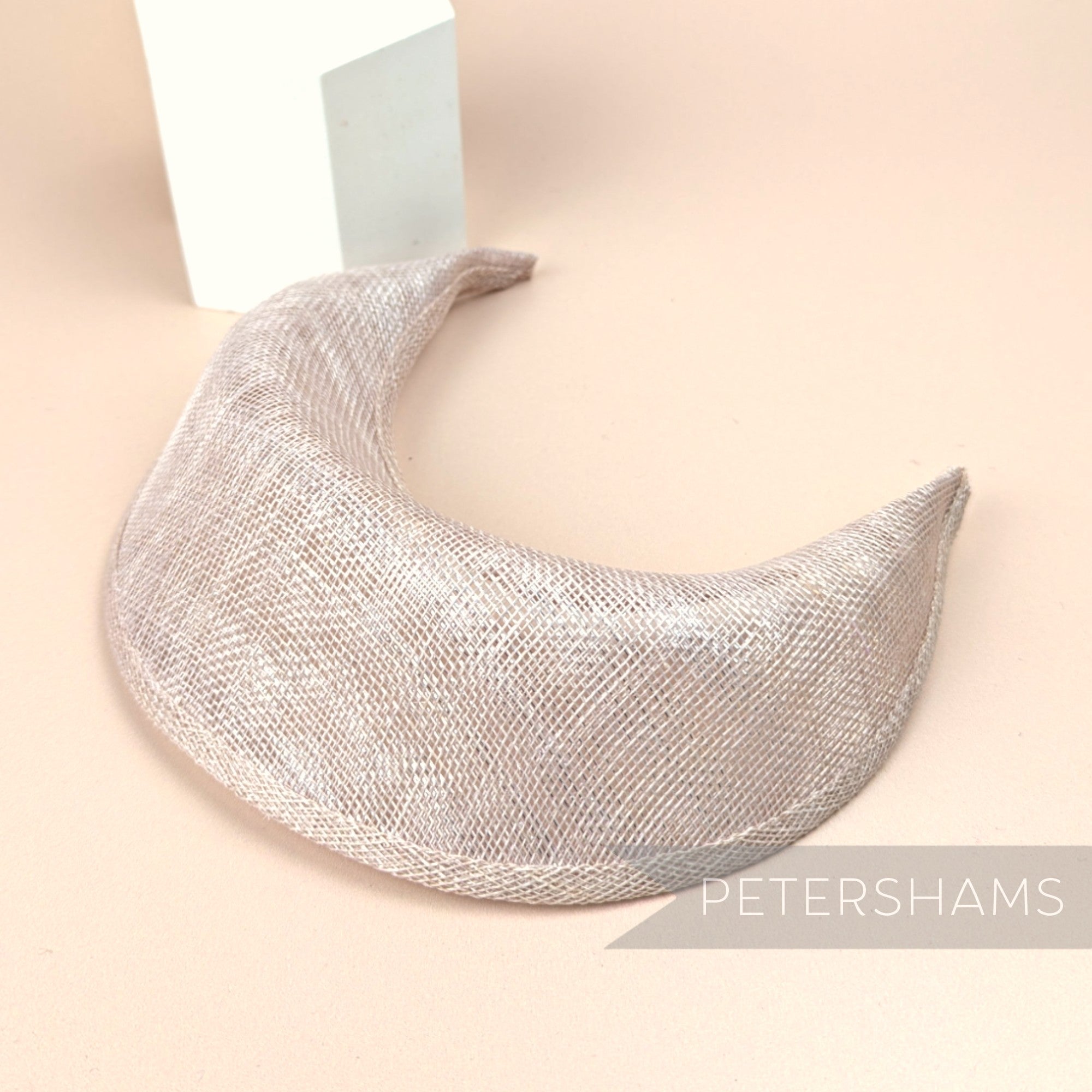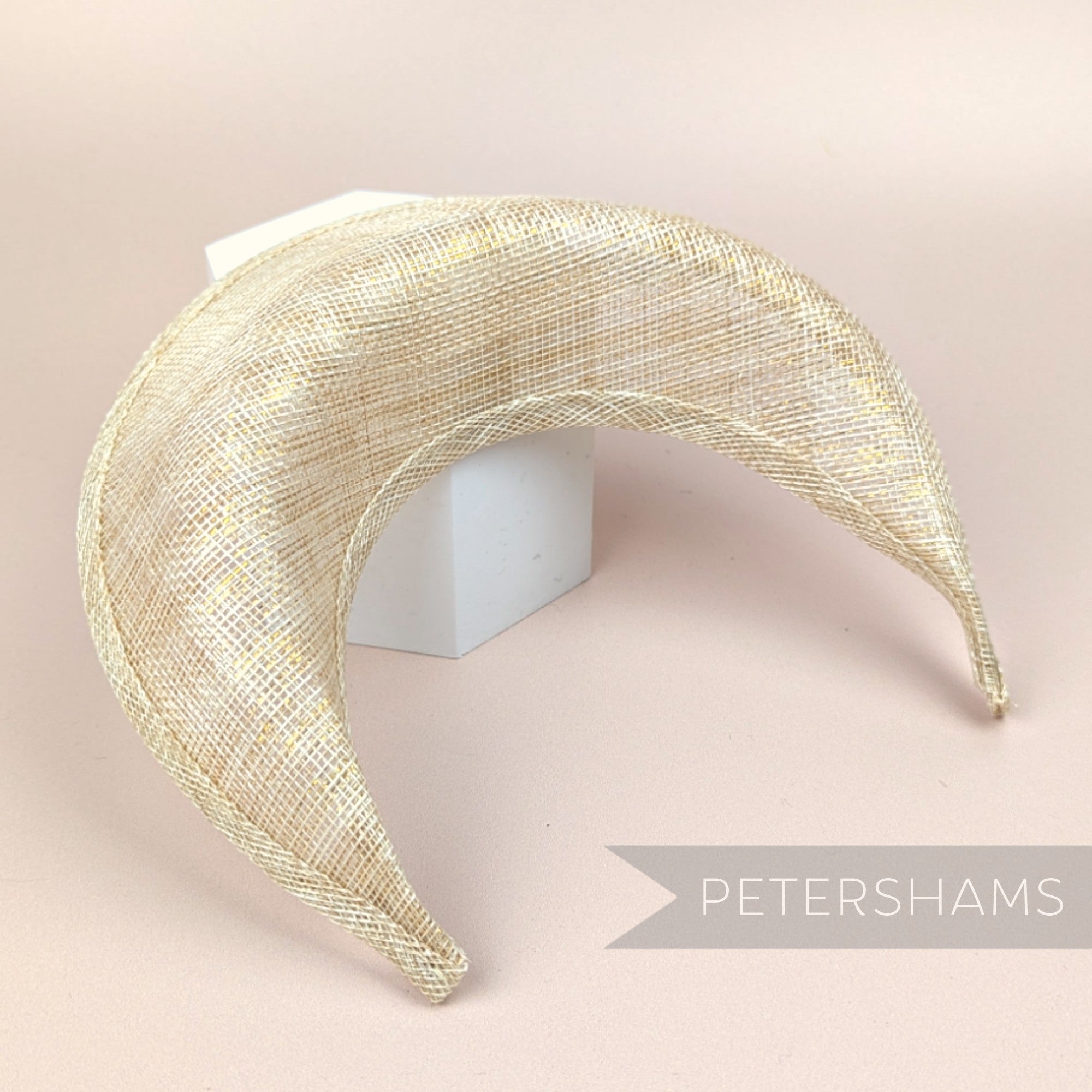 Made from a double layer of high-quality stiffened sinamay, with the underneath layer being made of metallic lurex sinamay for a subtle finish. Ideal if you're wanting a toned down version of our metallic lurex halo crowns. This shape has a domed front with a hollow underside, sinamay bias finished edges and tapered ends that sit nicely at the side of the head.