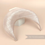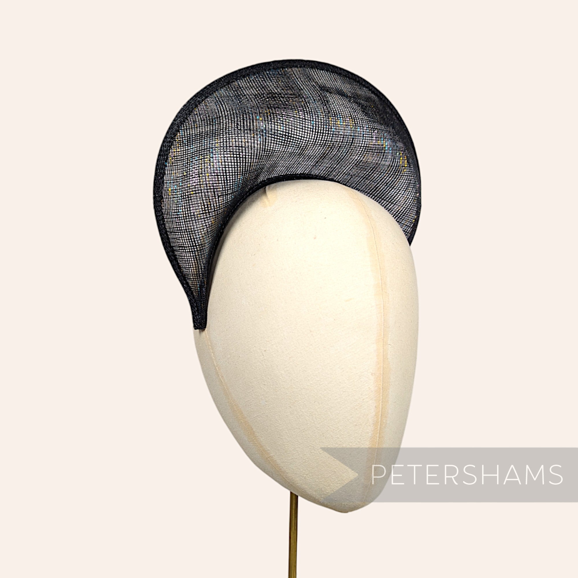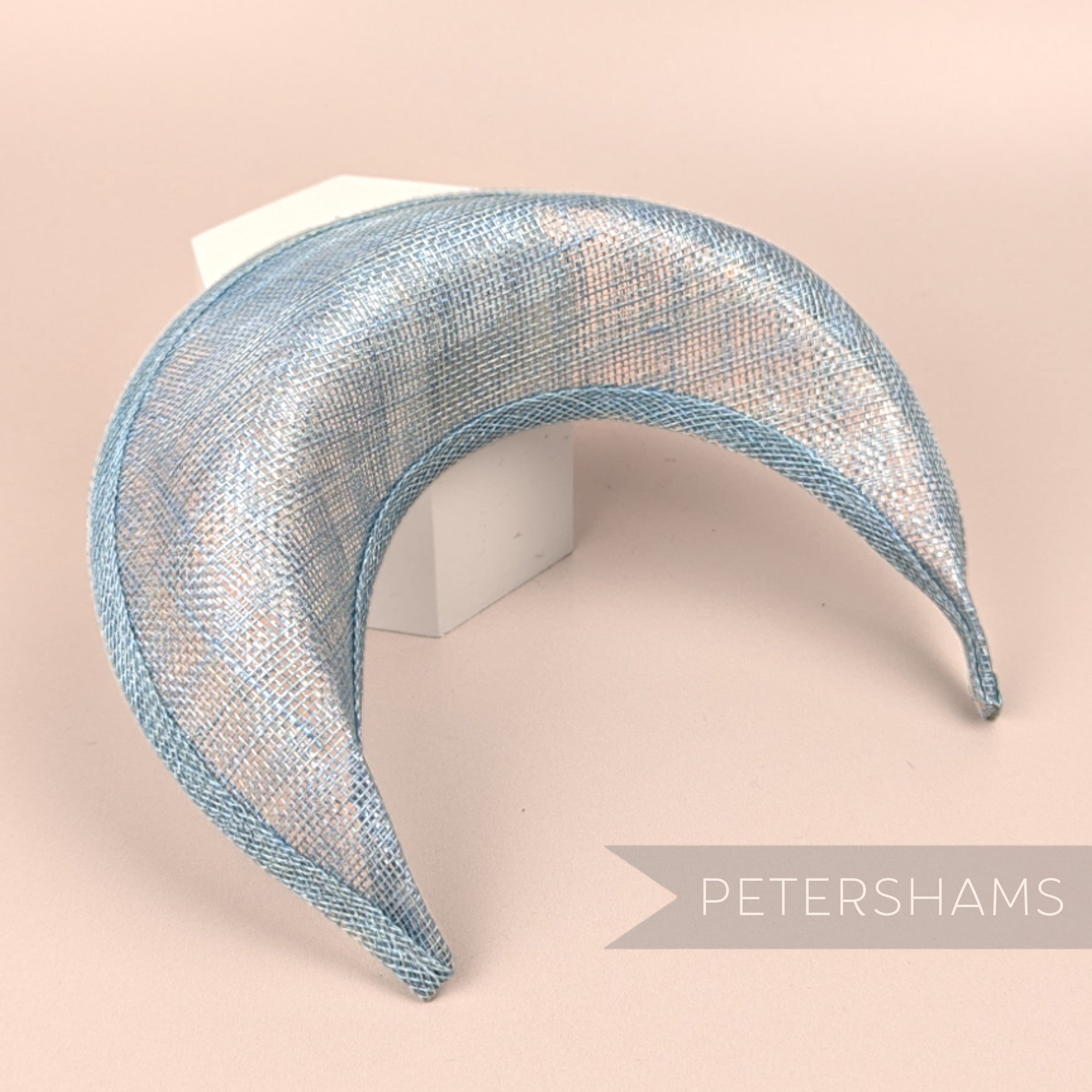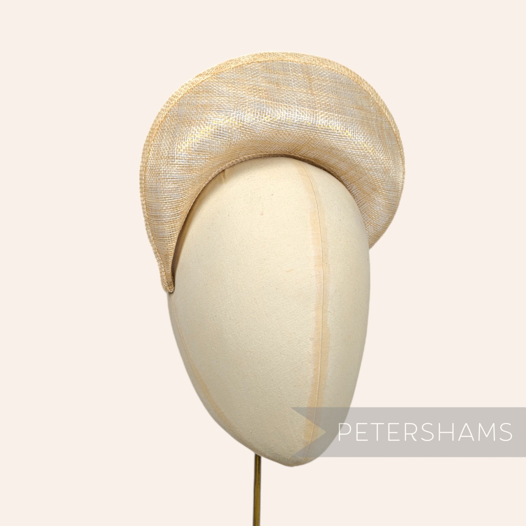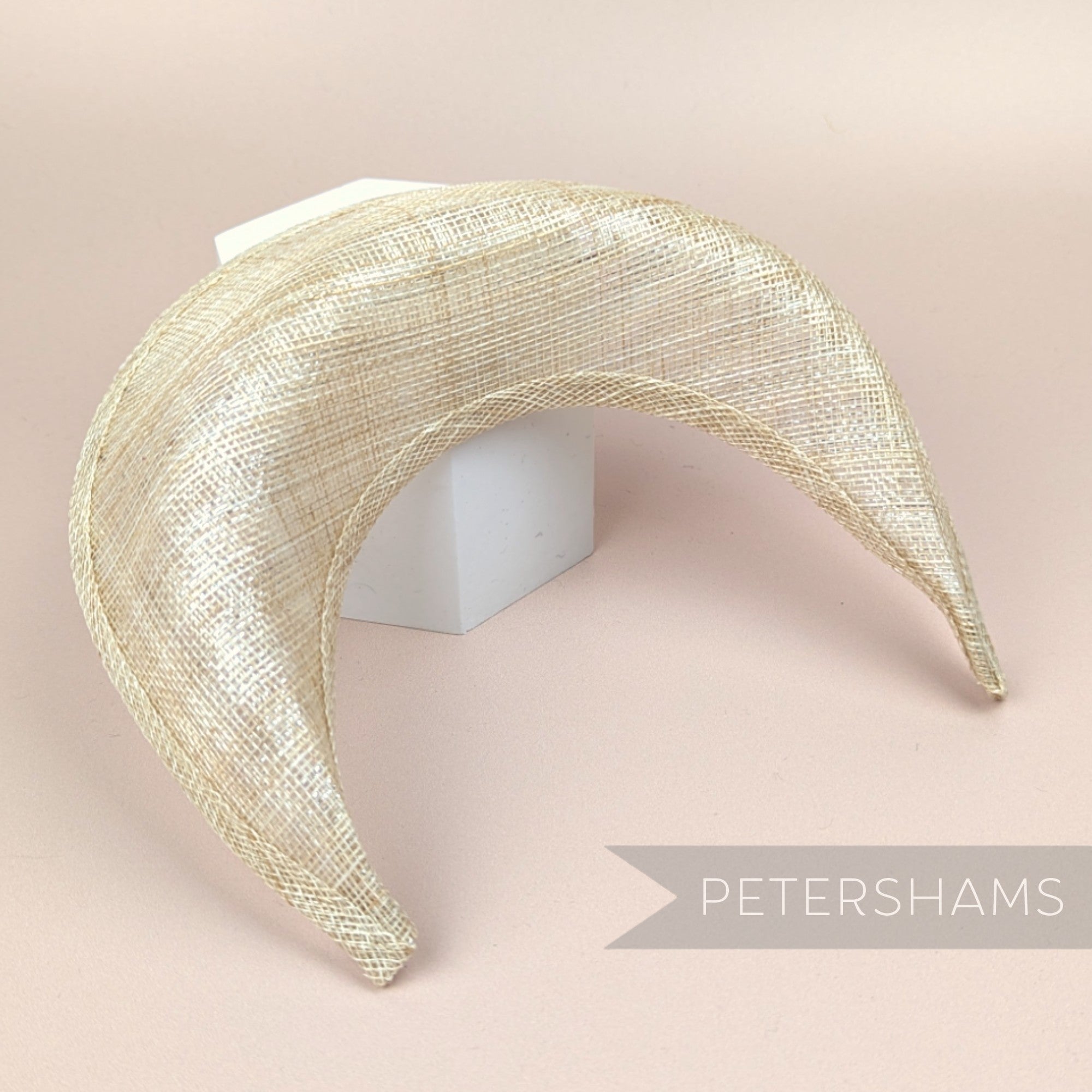 Made from a double layer of high-quality stiffened sinamay, with the underneath layer being made of metallic lurex sinamay for a subtle finish. Ideal if you're wanting a toned down version of our metallic lurex halo crowns. This shape has a domed front with a hollow underside, sinamay bias finished edges and tapered ends that sit nicely at the side of the head.