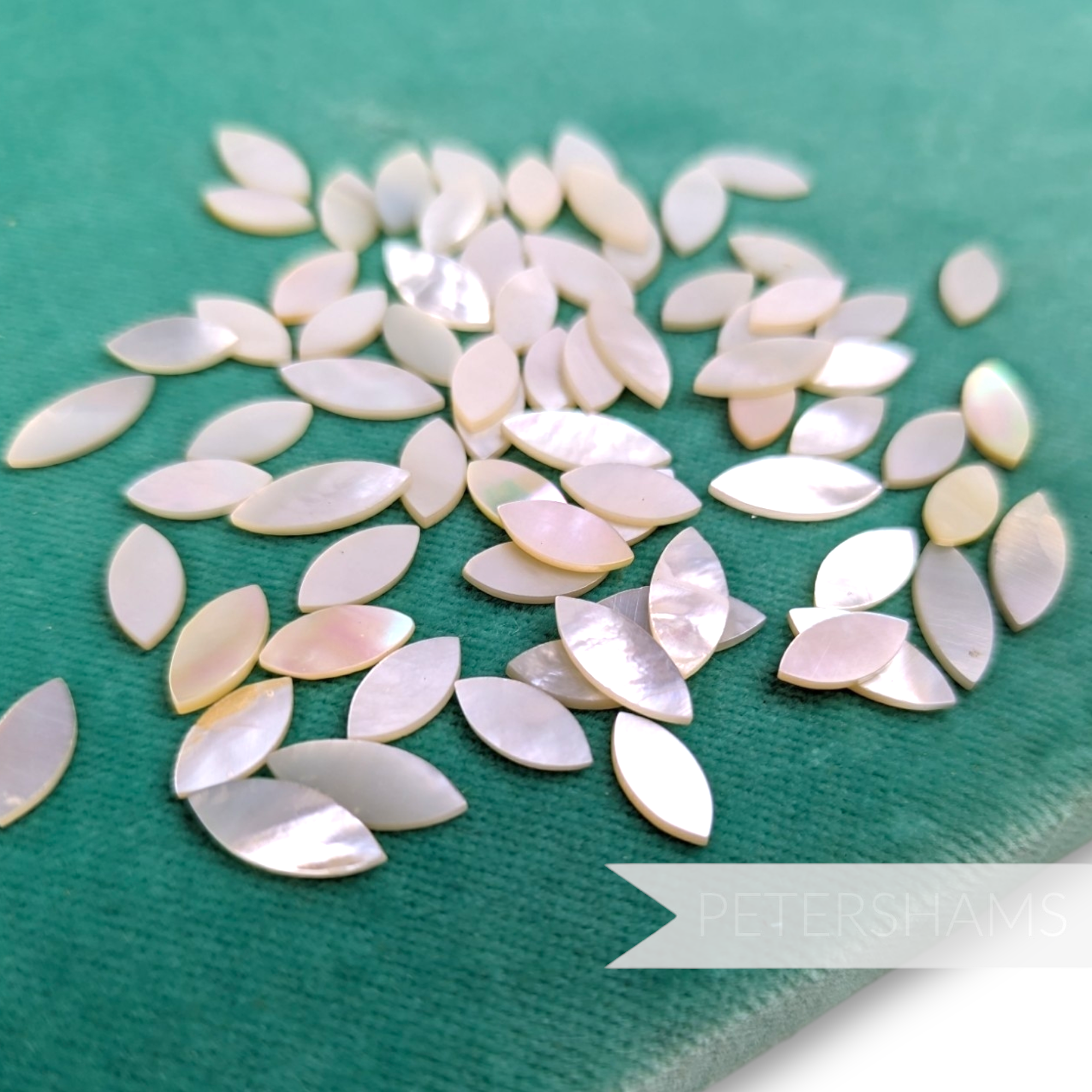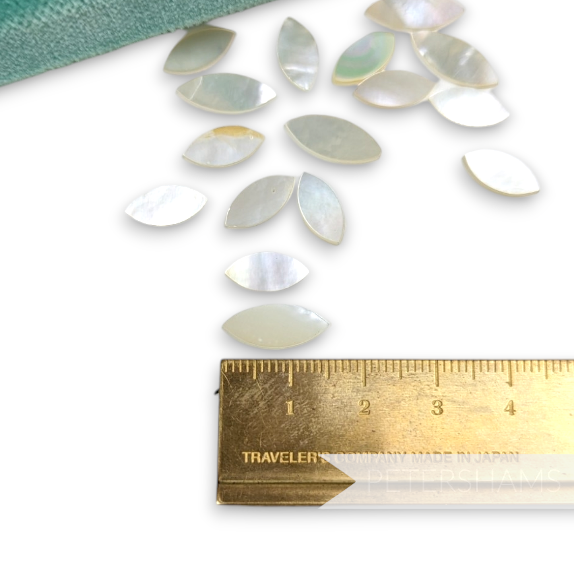 We have hit the mother lode here with these vintage mother of pearl simple petal shapes! These simple shapes have lovely flat backs, making them ideal for adorning a bridal piece or veiling.
