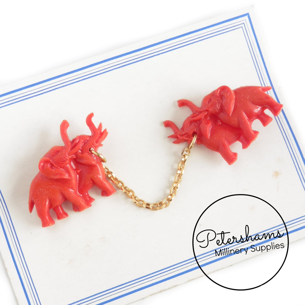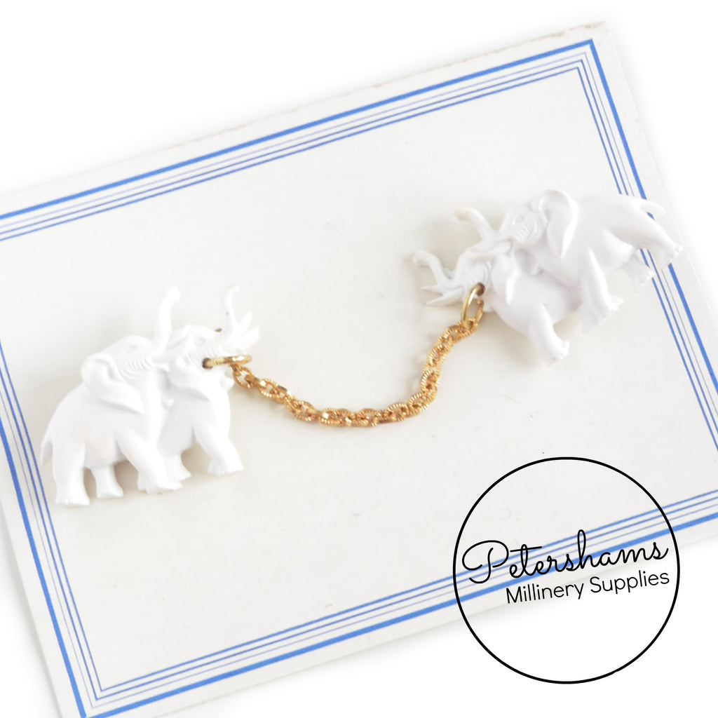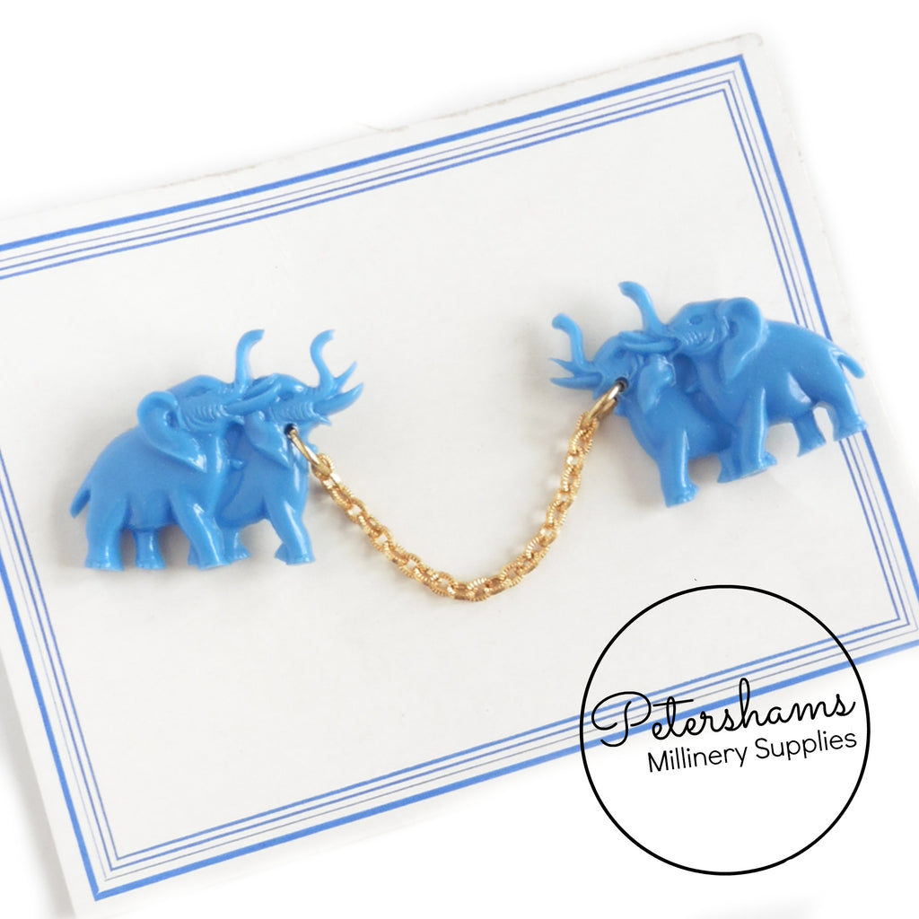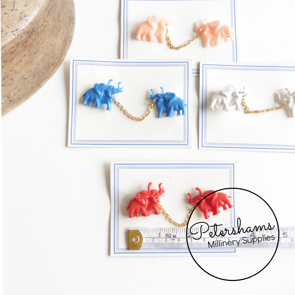 These adorable elephants date to the 1950s and are on their original card! Designed to pin to a collar or cardigan, they would also be super cute used as a brooch. Connected in the middle by a gold tone chain, they have a gold metal safety pin type closure at back.