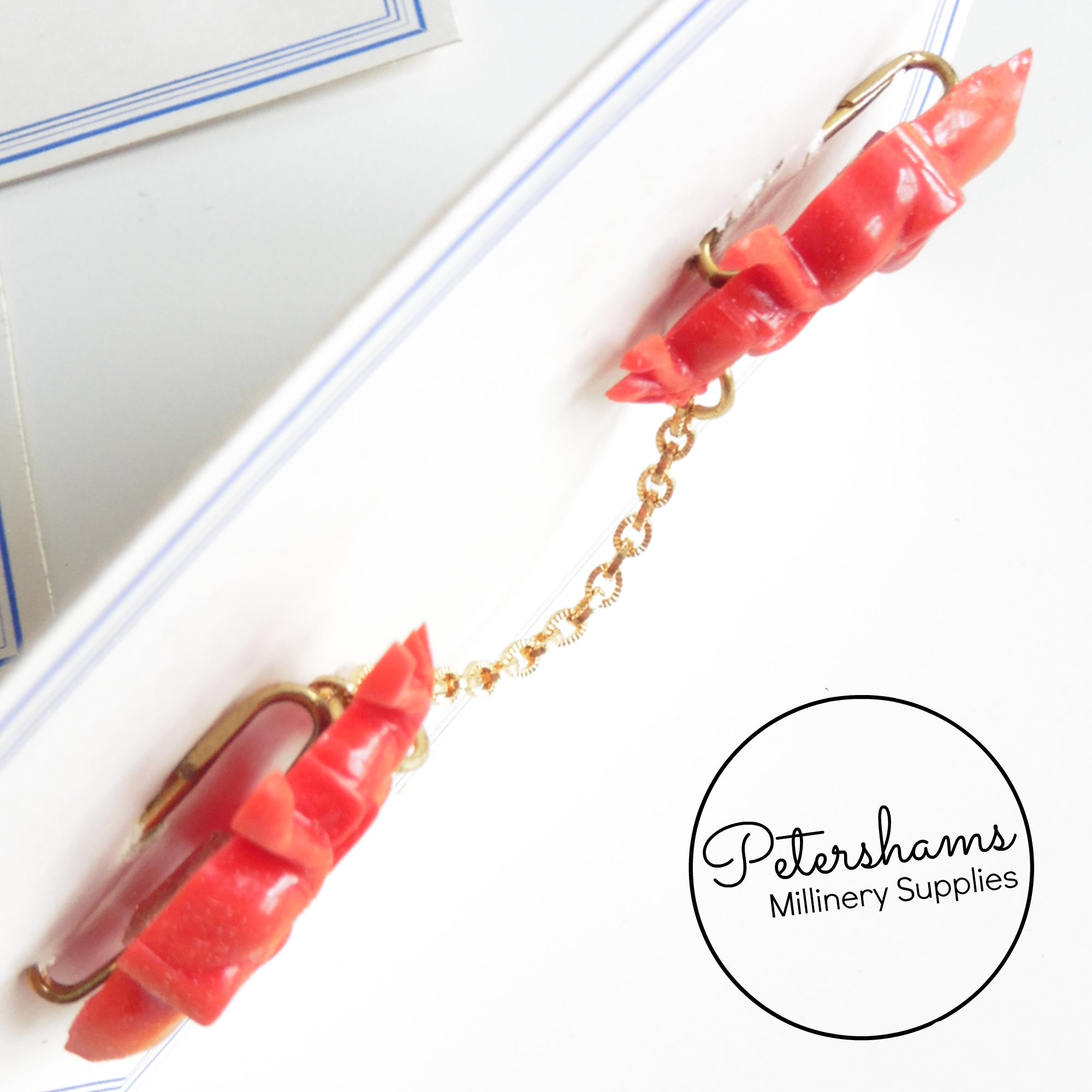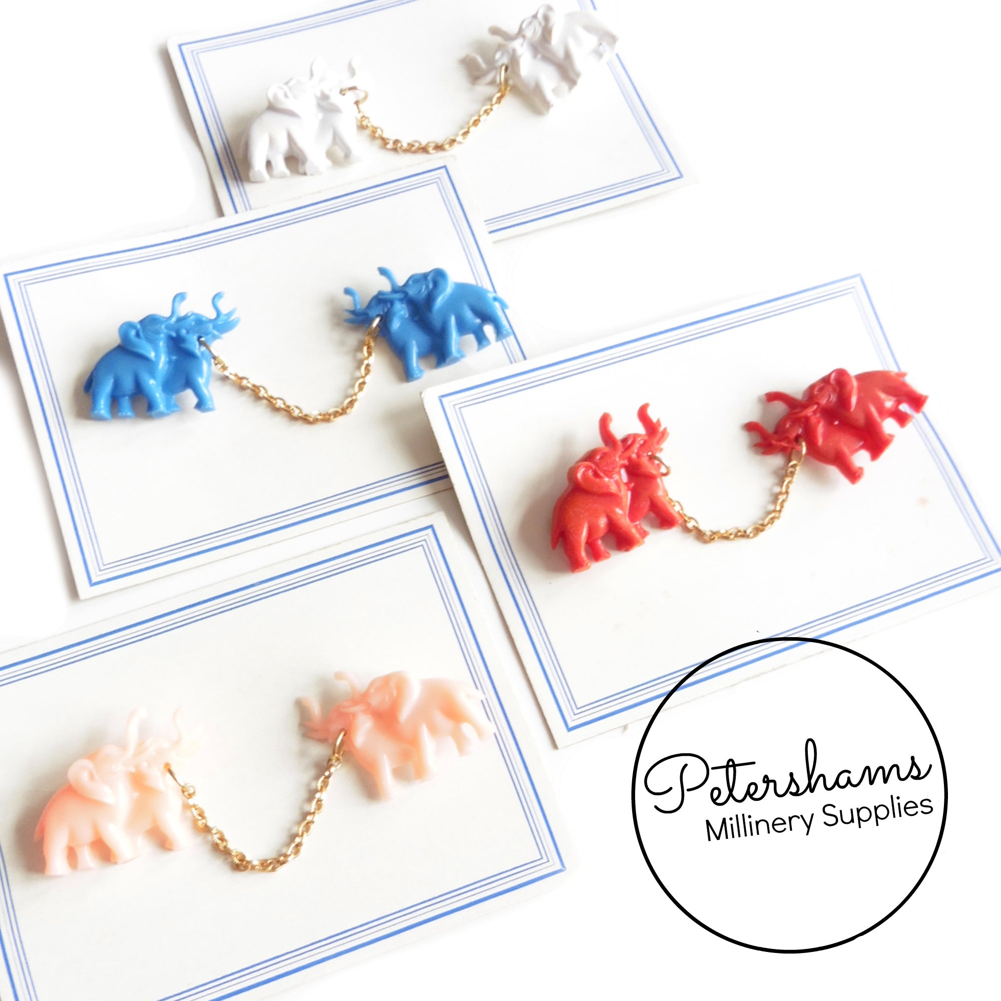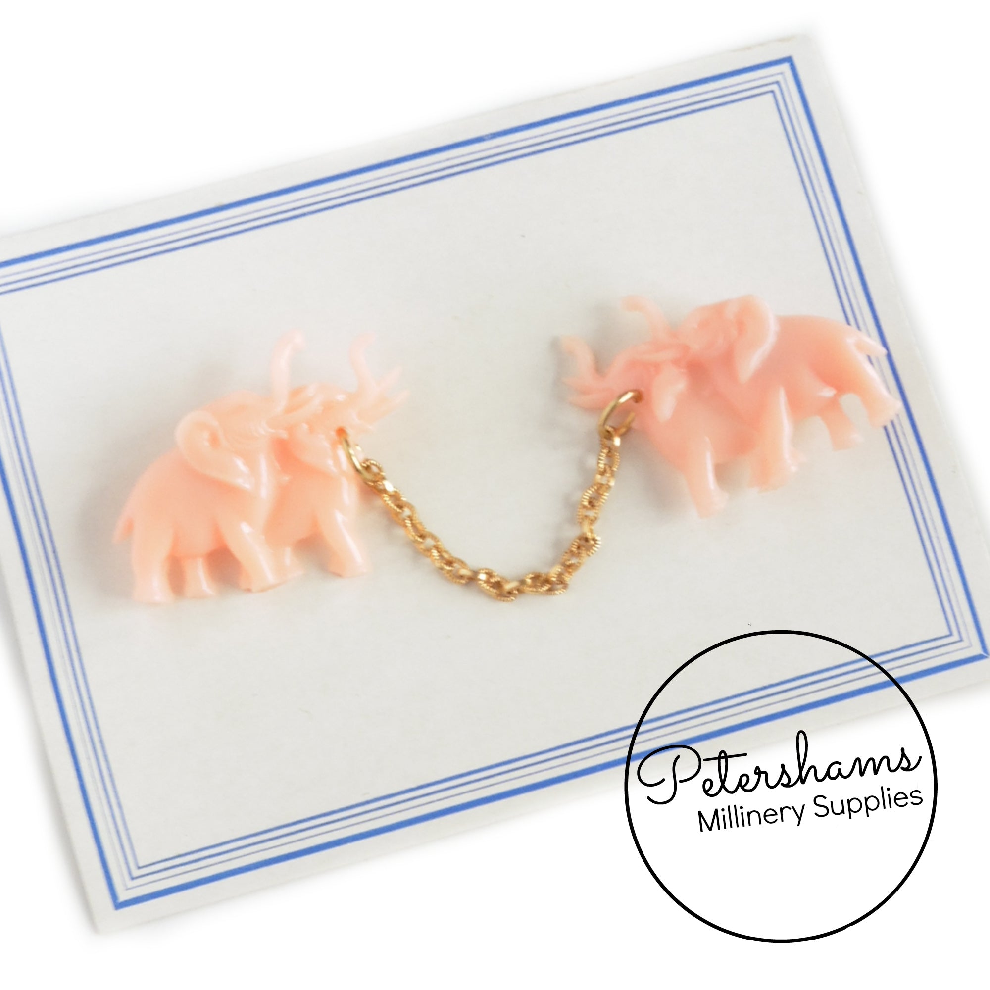 These adorable elephants date to the 1950s and are on their original card! Designed to pin to a collar or cardigan, they would also be super cute used as a brooch. Connected in the middle by a gold tone chain, they have a gold metal safety pin type closure at back.