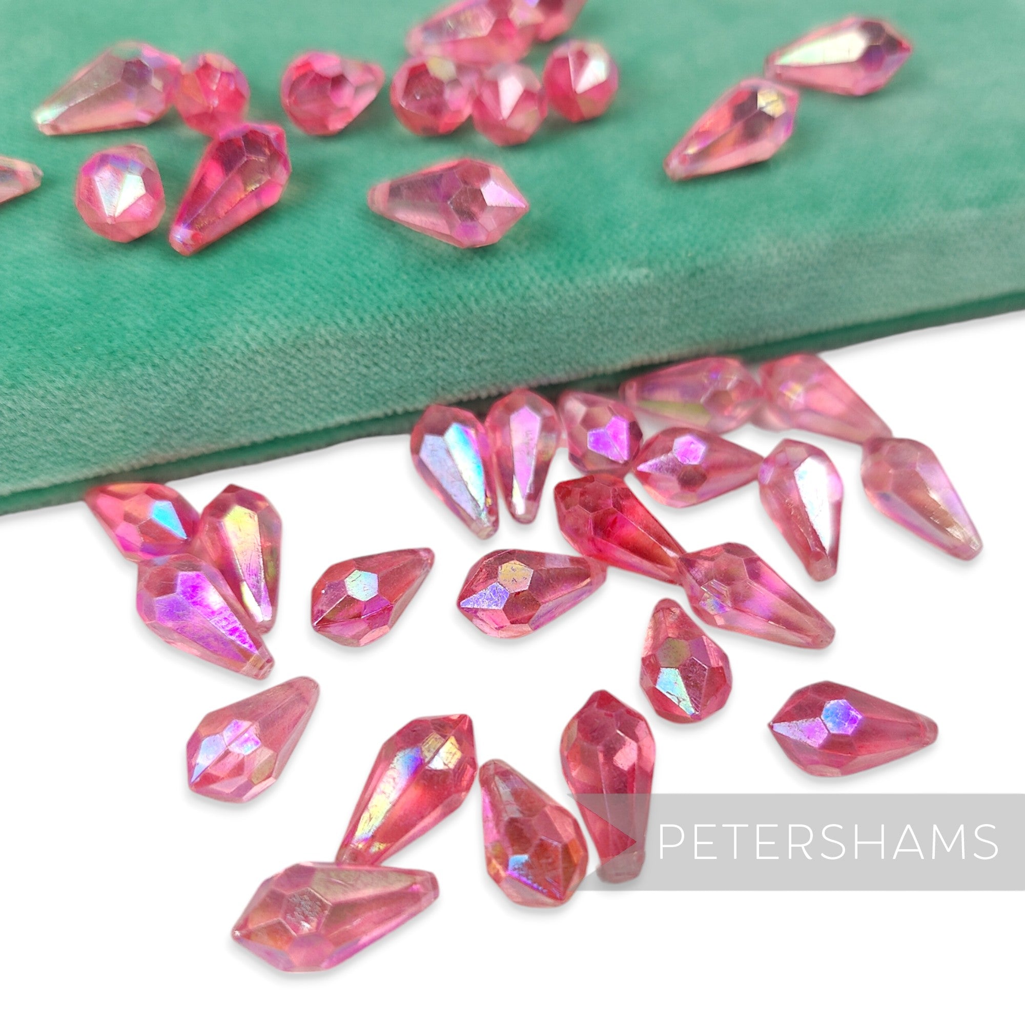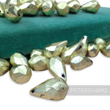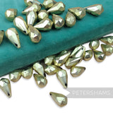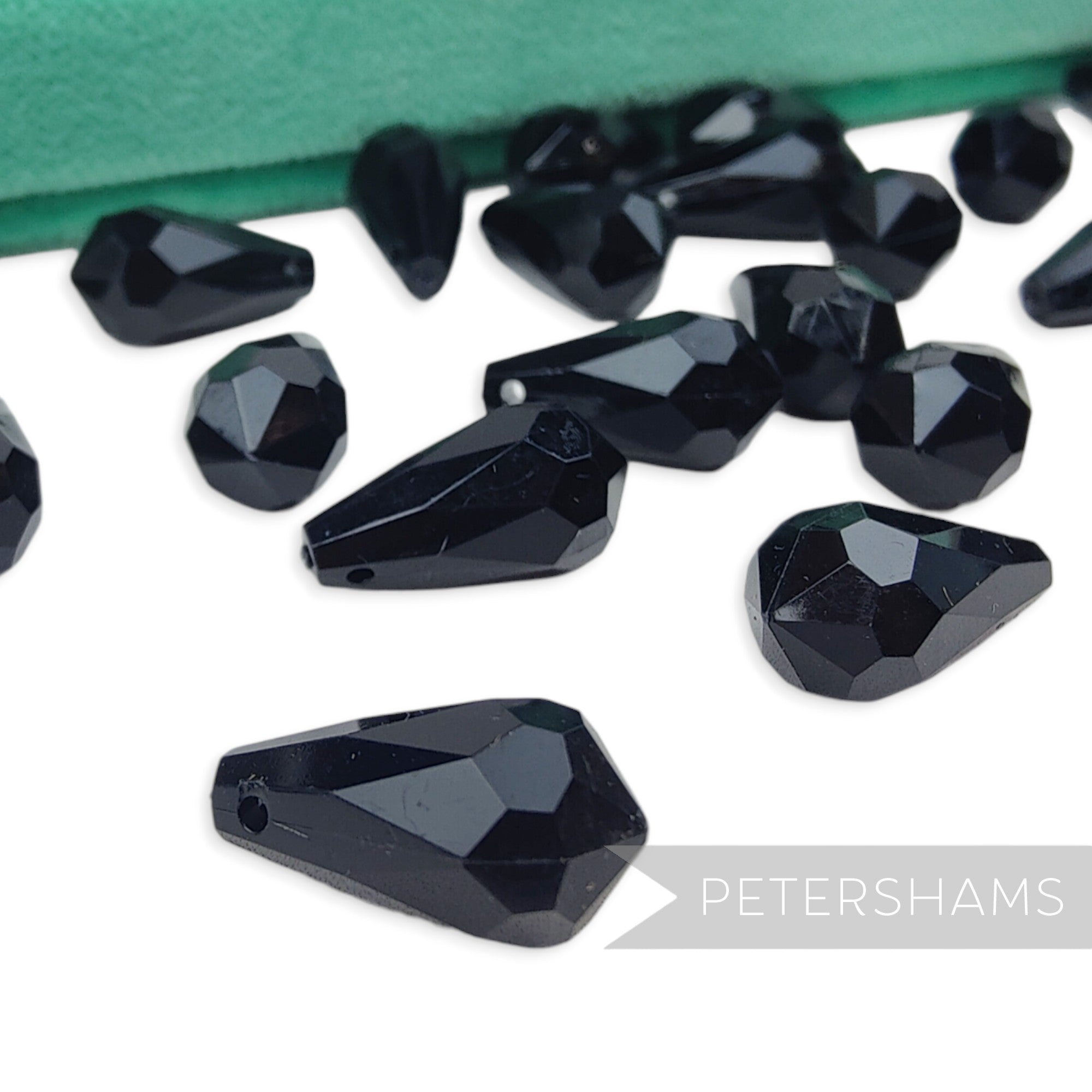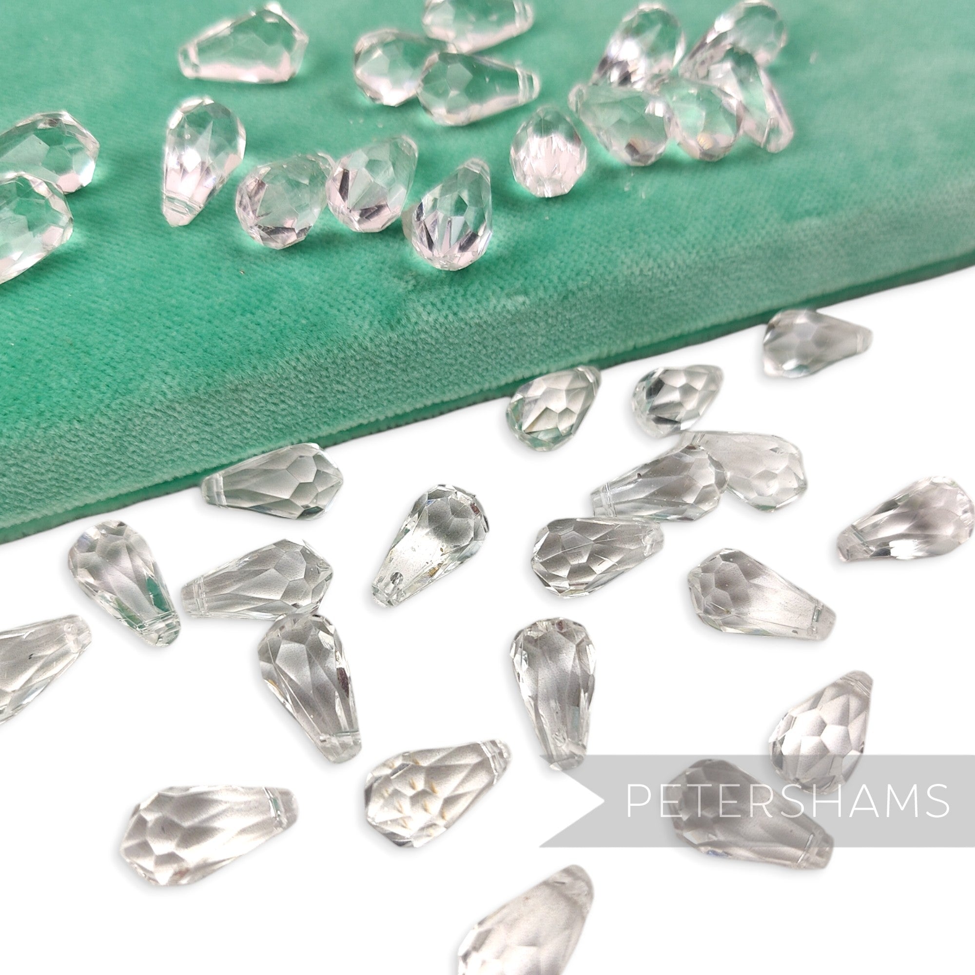 These incredible faceted beads are teardrop in shape and have one sew-hole at the top of the bead. Far superior when compared with some modern day equivalent, their unique shape and colouring is perfect for headpieces., costuming and jewellery.