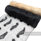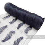 This pretty fabric features a is topped with a soft rounded shaped leaf applique on loose woven sinamay abaca. It has a great textural quality and would work wonderfully as a trim or simply blocked out over a simple shape.
