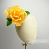 Accompanied by three leaves which have the most intricate zig-zagged edge, it is all attached to a wire stem so you can place and shape it onto your hat with ease.