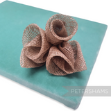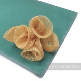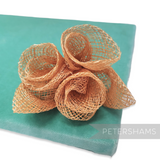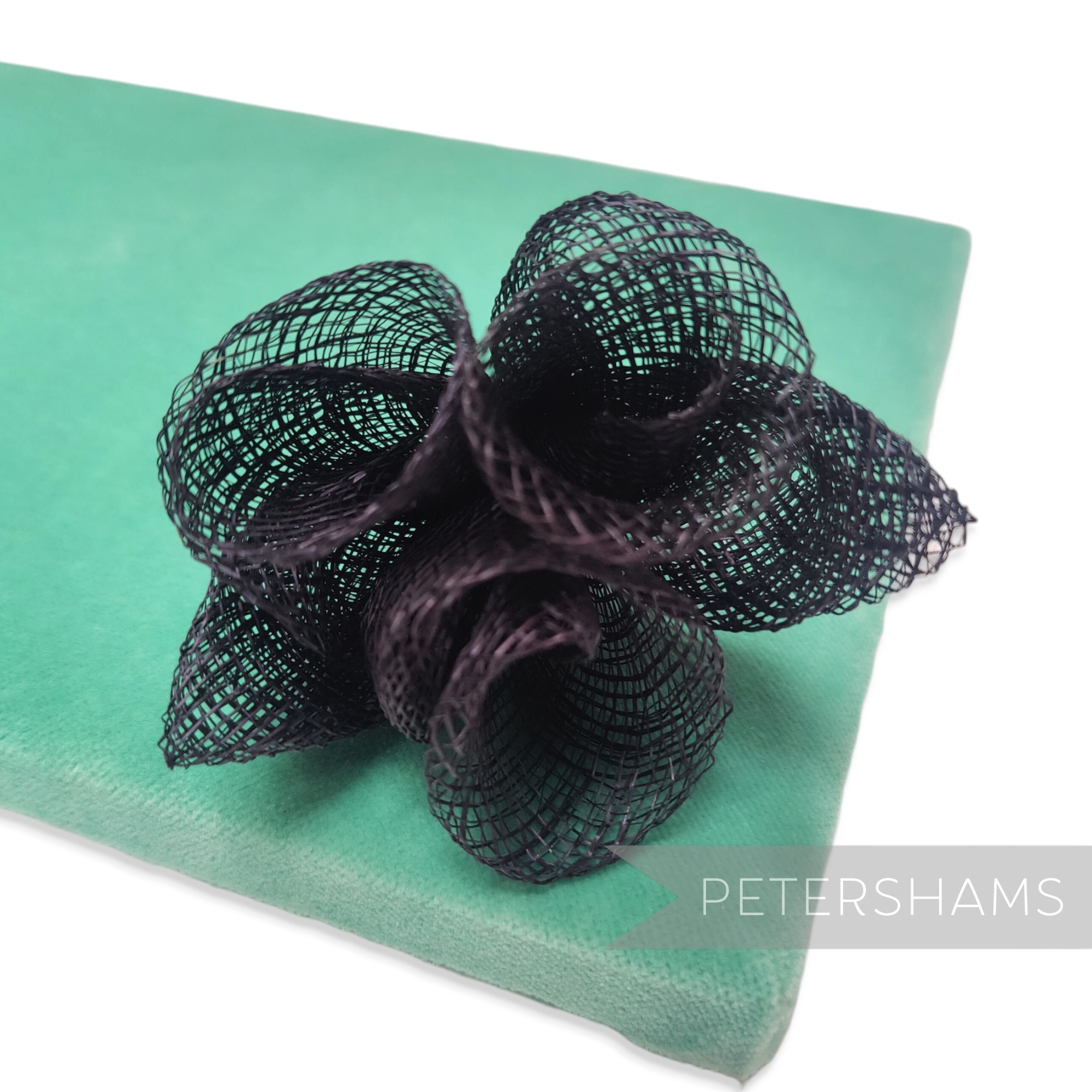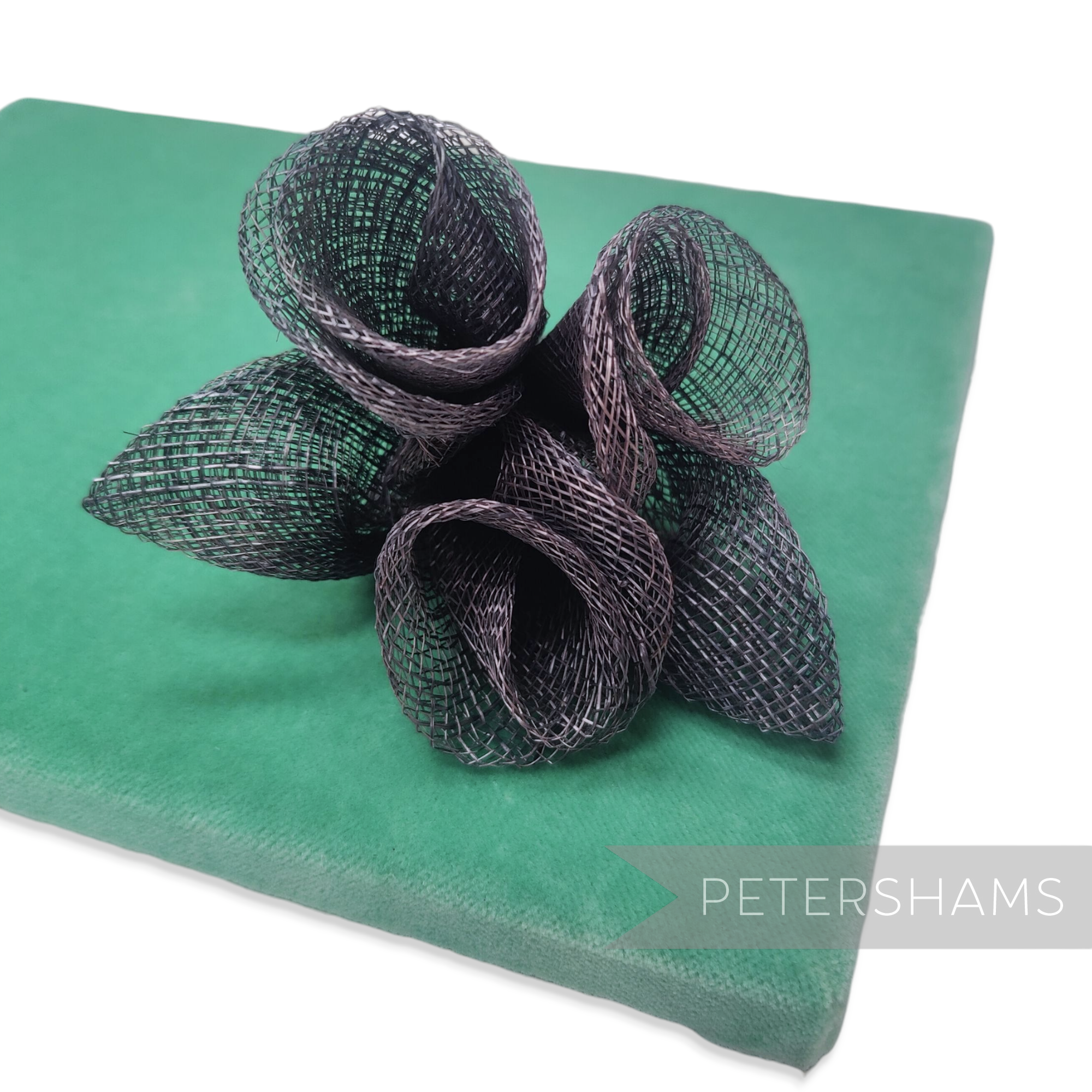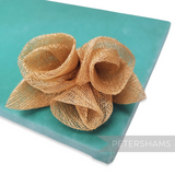 'Leah' is a petite hat flower made from handwoven sinamay formed into three rolled flower buds accompanied by two leaves. Makes for a pretty hat trim used singularly or group several together to make a larger statement piece!