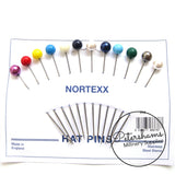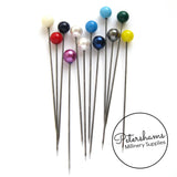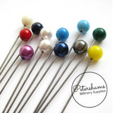 These 12 extra long pins are made from stainless steel and topped with a round acrylic bead. Ideal for use as hat pins with an extra sharp end. Comes in 12 assorted colours!