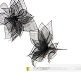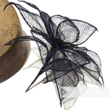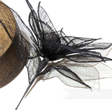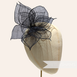 'Zelda' is a fabulous large bloom made out of sheer handwoven black sinamay. With really large pointed petals, it's accompanied by a single hand-rolled leaf, three balled up sinamay stamen centres and is all attached to wired stem so you can bend it to sit in your desired position.  Simply attach a clip or headband to use as a standalone piece or pop onto a large hat to make a big impact!